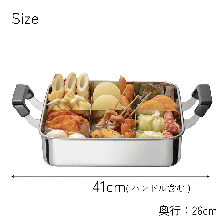 商品情報 屋台気分のおでん鍋 雰囲気満点の木蓋、角型の鍋形状、具材を分ける仕切り。おでん屋台の雰囲気を自宅で楽しめます。 ●ステンレス製のお鍋だから軽くて取り扱いがらくらく! ●一度温まったら冷めにくいのが特徴で、鍋物にぴったりです ●丈夫で変形しにくいため長く使うことができます サイズ(約) 幅41×奥行26×高さ11cm(蓋・ハンドル含む)本体重量/1200g満水容量/4.8L 材質 本体/ステンレス鋼(クロム18%・ニッケル8%) 底の厚さ/0.5mm 蓋/天然木 仕切り/ステンレス鋼 配送区分 【同梱OK】 備考 こんな方におすすめ 屋台 雰囲気 ほかほか あつあつ おでん おでん屋台 おでん鍋 屋台風 具 おでん具材 具材 こんにゃく 玉子 練り物 牛すじ 仕切り 仕切り付き 木蓋 木フタ 冷めにくい ステンレス 丈夫 長持ち 自宅 楽しめる 楽しい 雰囲気満点 角型 おしゃれ おすすめ RB-3261 4903779132612 として メーカー希望小売価格はメーカーカタログに基づいて掲載しています