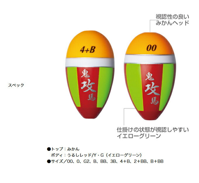 20191121-06海面下の仕掛けの方向が読み取れ、ウキ全体の動きが見えるキバカラーの装いも新たに、“みかんヘッド”が登場。全天候タイプカラーで近年に多い海の色(薄い青・白っぽい青)には抜群の視認性を発揮します。従来の「鬼馬ウキ 攻」よりも、3mm大きくし、プラス表記(4+B〜B+BB)はスリム形状にし、単発表記(00〜3B)はファットタイプで、どちらも高重心ウエイトを採用しています。●トップ:みかん ボディ:うるしレッド/Y・G(イエローグリーン)●サイズ/00、0、G2、B、BB、3B、4+B、2+BB、B+BB■関連商品:釣武者 鬼馬ウキ 攻 シリーズ