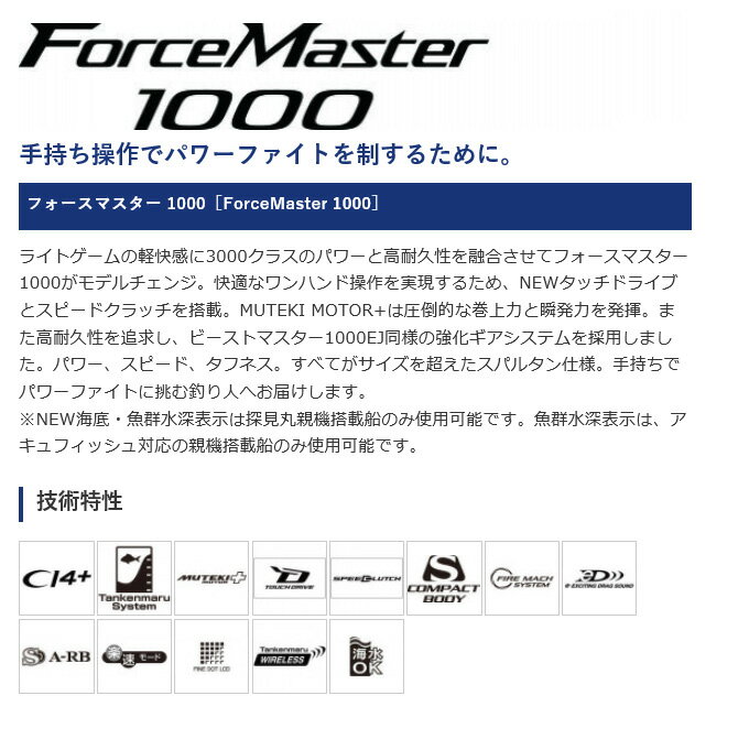 20210122-02【23済】手持ち操作でパワーファイトを制するために。【SHIMANO ForceMaster 1000】ライトゲームの軽快感に3000クラスのパワーと高耐久性を融合させてフォースマスター1000がモデルチェンジ。快適なワンハンド操作を実現するため、NEWタッチドライブとスピードクラッチを搭載。MUTEKI MOTOR+は圧倒的な巻上力と瞬発力を発揮。また高耐久性を追求し、ビーストマスター1000EJ同様の強化ギアシステムを採用しました。パワー、スピード、タフネス。すべてがサイズを超えたスパルタン仕様。手持ちでパワーファイトに挑む釣り人へお届けします。※NEW海底・魚群水深表示は探見丸親機搭載船のみ使用可能です。魚群水深表示は、アキュフィッシュ対応の親機搭載船のみ使用可能です。■スペック・商品の仕様等は商品画像をご参考ください。