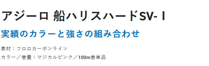 20230517-06【アジーロ 船ハリスハードSV-I】実績のカラーと強さの組み合わせ素材:フロロカーボンラインカラー/巻量:マジカルピンク/100m巻単品品群コード:1017≪マテリアル解説≫フロロカーボン(ポリフッ化ビニリデンモノフィラメント)フロロカーボンは、強さではナイロンにやや劣りますが、耐摩耗性に優れスレでキズつく心配が少ないので、耐久性に優れています。初期伸び率が低いので感度が良く、また、ナイロン同様適度な伸びがあることから衝撃を吸収することも可能です。ただし、糸質が硬いため、扱いには注意が必要です。 ≪商品概要≫<特徴>●ライン表面に硬質(ハード)な特性を付与させた船釣り仕掛け専用ハリスに「マジカルピンクカラー」を搭載。●ピンクカラーは「SV-I」シリーズが継承している、科学的な研究データを基にした魚から見えにくい特殊カラーです。●ラインの存在感を薄れさせることで、プレッシャーの高い船団の中や喰い渋りの状況下で釣果に差が出ます。●ピンクカラーが特に有効なマダイをはじめとした、様々な魚種に対応できる号数をラインナップ。●中型スプール仕様で、タックルバッグの中でもかさばりません。●ライン表面の凹凸を軽減する平行巻を採用。≪関連ワード≫SV-1、船ハリス、ライン、釣り、フィッシング、釣り糸、釣糸、ハリス、リーダー、SUNLINE、2023年モデル≪関連商品≫・サンライン アジーロ 船ハリスハードSV-I
