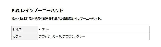 20230523-06【E.G.レインブーニーハット】撥水・防水性能と透湿性能を兼ね備えた高機能レインブーニーハット。●サイズ:フリー●カラー:ブラック、カーキ、ブラウン、グレー≪詳細・特徴≫■透湿防水素材「ブリザテック(R)」透湿防水素材「ブリザテック」は、生地表面は水をはじき、撥水・防水性能と、内部に滞留した湿気を外部に放散する性能を兼ね備えた高機能素材です。中層に形成した特殊なポリウレタンの微多孔質構造により、この膜の表面側が1?30マイクロメーターの細かい孔の開いた孔構造で、水滴はこの膜を通過できず、湿気は通過して外部に放出します。■あご紐強風などで飛ばされることを防ぐあご紐を装備。取り外し可能なスナップフック仕様。■サイズアジャスター後頭部びん裏には簡易なサイズアジャスター付き。■パッカブル機能ツバを頭頂部に向かって折りたたみ、内側のメッシュポケットを裏返してコンパクトに収納することが可能。≪関連ワード≫帽子、ハット、ウエア、ウェア、アウトドア、釣り、フィッシング、EG、エバーグリーン、EVERGREEN≪関連商品≫エバーグリーン E.G.レインブーニーハット