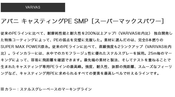 20230829-06Avani Casting PE SMP【アバニ キャスティングPE SMP[スーパーマックスパワー]】従来のPEラインに比べて、耐摩耗性能と耐久性を200%以上アップ!(VARIVAS社内比) 独自開発した特殊コーティングによって、PEの弱点を完璧に克服した。素材に選んだのは、完全8本撚りのSUPER MAX POWER原糸。従来のPEラインに比べて、直線強度も2ランクアップ(VARIVAS社内比)。ラインカラーには、水中でのカモフラージュ性に優れたステルスグレーを採用。25m毎のマーキングによって、容易に飛距離を確認できます。最先端の素材と製法、そしてテストを重ねることで生まれたキャスティング専用PEラインの最高峰。強度、耐久性、抜群の飛距離、スムーズなフィーリングなど、キャスティング用PEに求められるすべての要素を最高レベルで叶えるラインです。 ■カラー:ステルスグレーベースのマーキングラインPE:同号数のナイロンラインと比べて、2.5〜3倍の引張強度があるPE。ジギングやGTフィッシングをはじめとする大物狙いの定番ラインです。SMP:通常のPEラインの約2倍という耐摩耗性、耐久性を誇るライン。MAX POWER原糸に特殊コーティングを施すことで高強度、高耐久性を実現しています。SP-V:環境に配慮した非フッ素コーティング加工。ライン表面にできる保護膜の効果により、吸水劣化を抑え耐摩耗性および飛距離が向上します。≪関連ワード≫8本組、PEライン、釣り糸、ライン、釣り、フィッシング、2023年モデル、VARIVAS、モーリス≪関連商品≫VARIVAS アバニ キャスティングPE SMP