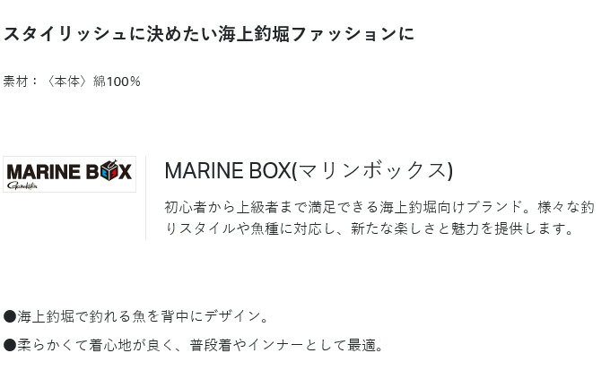 20240131-06【Tシャツ(MARINE BOX) GM3744】スタイリッシュに決めたい海上釣堀ファッションに素材:〈本体〉綿100%MARINE BOX(マリンボックス)初心者から上級者まで満足できる海上釣堀向けブランド。様々な釣りスタイルや魚種に対応し、新たな楽しさと魅力を提供します。●海上釣堀で釣れる魚を背中にデザイン。●柔らかくて着心地が良く、普段着やインナーとして最適。≪関連ワード≫GM-3744、半袖、Tシャツ、ウエア、ウェア、釣り、フィッシング、Gamakatsu、2024年モデル≪関連商品≫・がまかつ GM3744