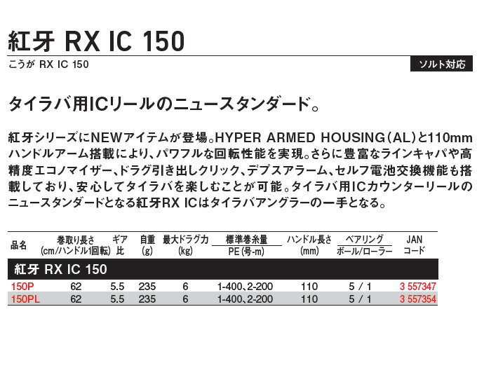 20250114-02【DAIWA 25 紅牙 RX IC 150 シリーズ】タイラバ用ICリールのニュースタンダード。紅牙シリーズにNEWアイテムが登場。HYPER ARMED HOUSING(AL)と110mmハンドルアーム搭載により、パワフルな回転性能を実現。さらに豊富なラインキャパや高精度エコノマイザー、ドラグ引き出しクリック、デプスアラーム、セルフ電池交換機能も搭載しており、安心してタイラバを楽しむことが可能。タイラバ用ICカウンターリールのニュースタンダードとなる紅牙RX ICはタイラバアングラーの一手となる。※スペックは商品画像をご参考ください。-----------■バリエーション4550133557347 IC 150P4550133557354 IC 150PL