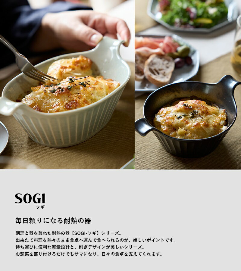 メーカー希望小売価格はメーカーカタログに基づいて掲載しています 商品説明 毎日頼りになる耐熱の器 調理と器を兼ねた耐熱の器【SOGI- ソギ】シリーズ。 出来たて料理を熱々のまま食卓へ運んで食べられるのが、嬉しいポイントです。 持ち運びに便利な軽量設計と、削ぎデザインが美しいシリーズ。 お惣菜を盛り付けるだけでもサマになり、日々の食卓を支えてくれます。 ブランド TAMAKI シリーズ ソギ 商品名 ラウンドグラタン 品番 ホワイト:T-957080 ブラック:T-957097 グレー:T-958841 JAN ホワイト:4965643957080 ブラック:4965643957097 グレー:4965643958841 サイズ 幅19×奥行き13.7×高さ7cm 容量 450ml 重量 約250g 素材・材質 耐熱陶器 原産国 日本 美濃焼 機能・その他 電子レンジ対応 オーブン対応 家庭用食洗機対応 ※直火不可 ご注意 サイズ、容量は商品の特性上、多少の誤差が生じますのでご了承ください。 商品の特性上、多少の擦り傷やガタつきが生じる場合がございます。 製造時期(ロット違い)によっては、商品の色に多少の違いがある場合があります。 掲載の商品写真はあくまでも一例です。 製品の仕様は品質向上の為、予告なく変更することがあります。 焼き物の特徴をご理解の上、ご購入をお願いいたします。 商品の特性上、お客様のご都合(サイズ違い、オーダー間違い、イメージ違いなど)での返品・交換は一切受け付けておりません。 お客様のお使いのモニター設定、お部屋の照明等により実際の商品と色味が異なって見える場合がございます。 ご使用上の注意 使用する前に必ず破損・ヒビなどの異常がないことを確認してください。 破損・ヒビなどがある場合は使用しないでください。 使用する前にやわらかいスポンジなどで洗浄してください。 当店取り扱い商品の材質・製造工程上、表面に多少の色むらや釉垂れ、小さな穴、黒い点などがみられる場合がありますが、使用上問題はありません。 本製品はワレモノです。お取り扱いには充分気をつけてください。 強い衝撃や急激な温度変化により割れたり欠けたりする場合があります。 テーブルや食器棚等の上で引きずらないでください テーブル等の表面を傷つける場合があります。 洗浄する際は、スチールたわしや研磨剤入りスポンジを使用しないでください。 本体に傷をつけ、破損の原因になります。 使用後は食器用洗剤で洗浄し、乾燥させてから収納してください。 その他 この商品は当店他店舗でも販売しております。在庫数の更新は随時行っておりますが、お買い上げいただいた商品が、品切れになってしまうこともございます。 その場合、お客様には必ず連絡をいたしますが、万が一入荷予定がない場合は、キャンセルさせていただく場合もございますことをあらかじめご了承ください。 【関連キーワード】 正月・年賀・こどもの日・母の日・父の日・お盆・御中元・残暑見舞い・敬老の日・ハロウィン・クリスマス・御歳暮 ・年末バレンタイン・パーティー・贈答品・ギフト・贈り物・プレゼント・誕生日・バースデー・結婚・結婚祝い・出産祝い・台湾・台灣・魯肉飯・ルーローハン・新築祝い・引っ越し祝い・引っ越し御祝い・就職祝い・退職祝い・結婚内祝い・快気祝い・内祝い・合格祝い・成人式・記念日・周年記念・引き出物・家族・お父さん・お母さん・おじいちゃん・おばあちゃん兄弟・姉妹・子供・先生・恩師・職場・上司・先輩・後輩・同僚・取引先・転職・お餞別・贈答品・粗品・手土産・心ばかり・寸志・記念品・景品・プチギフト・お土産・手土産・挨拶・ご挨拶・御挨拶・ごあいさつ・お見舞い・御見舞・引っ越し・お礼・御礼・クリスマス・新年会・忘年会・歓迎会・送迎会・同窓会・宴会・二次会・結婚式・婚活パーティー・景品・参加賞・粗品・女性・男性・主婦・料理人・プロ・飲食店・シェフ・子供・キッズ・ソムリエ・お弁当女子・料理男子・キャンプ女子・かわいい・食器・オシャレ・新生活向け・陶器・現代風・子供用・大人・渋い・綺麗・きれい・美しい・映える・SNS映え・インスタ映え・モッパン・コーヒー・アイスコーヒー・ビール・漬物・インテリア・インテリア雑貨・小物入れ・日用品毎日頼りになる耐熱の器 調理と器を兼ねた耐熱の器【SOGI- ソギ】シリーズ。 出来たて料理を熱々のまま食卓へ運んで食べられるのが、嬉しいポイントです。 持ち運びに便利な軽量設計と、削ぎデザインが美しいシリーズ。 お惣菜を盛り付けるだけでもサマになり、日々の食卓を支えてくれます。 ▼ご使用イメージ▼ メーカー希望小売価格はメーカーカタログに基づいて掲載しています SPEC 商品説明 毎日頼りになる耐熱の器 調理と器を兼ねた耐熱の器【SOGI- ソギ】シリーズ。 出来たて料理を熱々のまま食卓へ運んで食べられるのが、嬉しいポイントです。 持ち運びに便利な軽量設計と、削ぎデザインが美しいシリーズ。 お惣菜を盛り付けるだけでもサマになり、日々の食卓を支えてくれます。 ブランド TAMAKI 