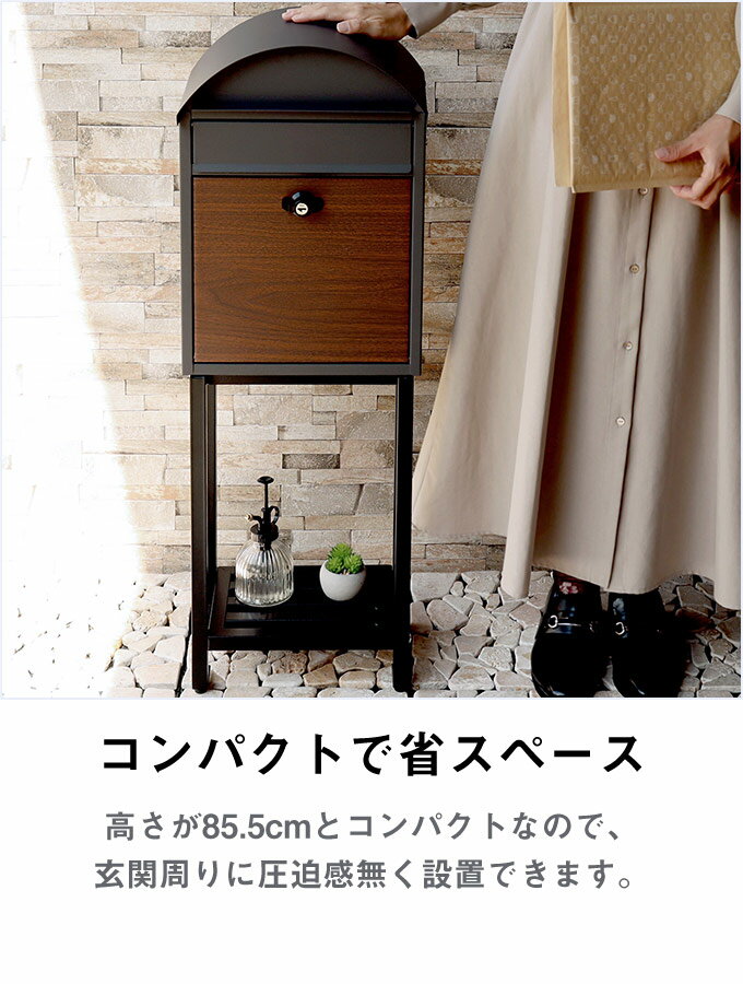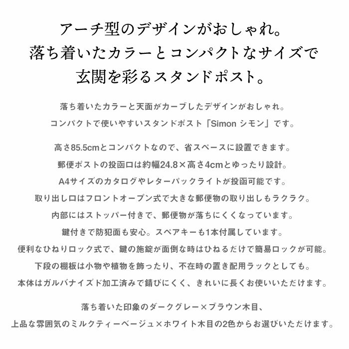 アーチ型のデザインがおしゃれ。落ち着いたカラーとコンパクトなサイズで玄関を彩るスタンドポスト。 落ち着いたカラーと天面がカーブしたデザインがおしゃれ。コンパクトで使いやすいスタンドポスト「Simon シモン」です。 高さ85.5cmとコンパクトなので、省スペースに設置できます。郵便ポストの投函口は約幅24.8×高さ4cmとゆったり設計。A4サイズのカタログやレターパックライトが投函可能です。取り出し口はフロントオープン式で大きな郵便物の取り出しもラクラク。内部にはストッパー付きで、郵便物が落ちにくくなっています。鍵付きで防犯面も安心。スペアキーも1本付属しています。便利なひねりロック式で、鍵の施錠が面倒な時はひねるだけで簡易ロックが可能。下段の棚板は小物や植物を飾ったり、不在時の置き配用ラックとしても。本体はガルバナイズド加工済みで錆びにくく、きれいに長くお使いいただけます。 落ち着いた印象のダークグレー×ブラウン木目、上品な雰囲気のミルクティーベージュ×ホワイト木目の2色からお選びいただけます。 【商品詳細】 全体のサイズ/幅30×奥行20×高さ85.5cm(アジャスター込み) 重量/6.2kg ポスト投函口/約幅24.8×高さ4cm ポスト取出口/約幅24.8×奥行16.3×高さ21.8cm 金属(鉄)・・・ガルバナイズド処理を施しています 粉体塗装 組立品 SDM-070:ダークグレー/ブラウン木目, SDM-071:ミルクティーベージュ/ホワイト木目 生産国:中国 ●完全防水仕様ではありませんので、軒下や屋根がある場所への設置を推奨致します。 品番:MO-SIMON その他のポスト・宅配ボックス・はこちら 検索用キーワード/キャスター 安心 安全 アパレル ファッション アメリカン 西海岸 シンプル モダン レトロ シンプルモダン シンプルナチュラル 一人暮らし ひとり暮し ファミリー ワンルーム おしゃれ スタイリッシュ 激安セール 格安 激安 送料込み 送料無料