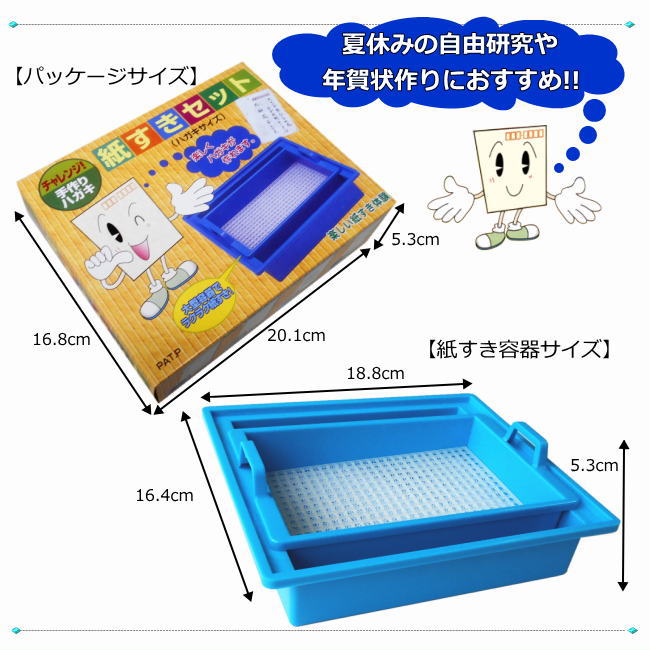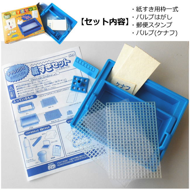 ※10個セットは、受注後の取り寄せとなります。納期は店舗からのお知らせをお待ち下さい。 ハガキが作れる紙すきセット かんたん!おしばなづくり 植物標本ワンタッチシート 「紙すきセット」について ◆「紙すきセット」は、自分だけのオリジナルはがきを作る楽しさを体験できる工作キットです。 ◆付属のパルプからは1枚で2枚のハガキを作ることができます。 ◆パルプのみの別売もあります。 ◆使用済みの紙パックやキャベツなど繊維の多い野菜などからも作ることができます。 ◆素材を工夫して個性的な紙作りとリサイクル工作に挑戦してみよう。 ◆夏休みや冬休みの自由研究や年賀状作りに最適です。 ◆説明書付きなので、初めての方でも簡単に紙すきの工程を楽しむことができます。 ◆郵便スタンプが付属しているので、完成したハガキを実際に送ることができます。 ◆敬老の日やクリスマスなどのメッセージカードやプレゼント作りにもおすすめです。 【内容品】 ・紙すき用容器、枠一式 ・パルプはがし ・郵便スタンプ ・パルプ(ケナフ) ・説明書