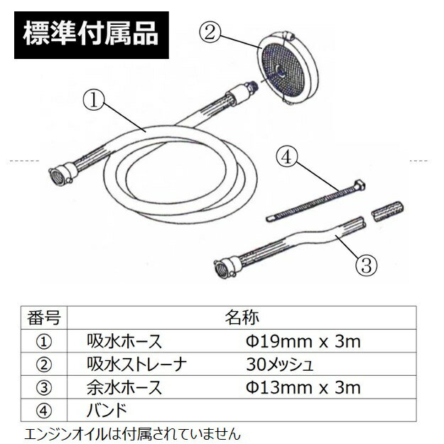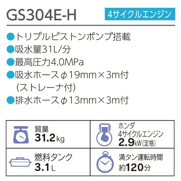 商品説明 丸山製作所公式オンラインショップ 商品名:エンジンセット動噴 GS304E-H 丸山品番:358592 JANコード:4941735020085 ご使用前に取扱説明書をお読みのうえ、正しくお使いください ■主な仕様 - ポンプ名称:トリプルピストンポンプ - 最高圧力:4.0MPa - 最高吸水量:31リットル/分 - エンジン:4サイクルエンジン - エンジン名称:ホンダGX160 - エンジンオイル容量:0.58リットル - (エンジンオイルは付属されていません) - 燃料タンク容量:2.0リットル - 使用時間目安:満タン時約120分 ■付属品: 吸水ホースΦ19mm x 3m、吸水ストレーナ、余水ホースΦ13mm x 3m ■用途 本製品は次のような作業にご使用いただけます。それ以外での ご使用はしないでください。 また本製品は洗浄用もしくは灌水、 薬剤散布用です。 化学薬品、高粘度液、海水及び高温水について は使用できません。 - 水田作物、一般畑作物、果樹、桑、樹木病害虫に対する薬剤散布 - 牧舎、鶏舎、及び都市衛生用、殺虫液の散布 - 液剤飼料の散布 - 水田作物、一般畑作物への散水及び灌水 - 牧舎、鶏舎及び農作物・農機具の洗浄 - 建築構造物の壁面などの洗浄 1年間のメーカー保証 保証規定 (保証書より抜粋) 1.保証期間 ・お買い上げ日から1年間とします。 2.保証の内容 ・保証期間内に本機を構成する部品に、材料または構 造上の欠陥が生じ、弊社がそれを認めた場合に限り 取替えまたは、修理を無料で致します。 3.保証できない事項 ・保証期間内でも次のような場合には有料修理になり ます。 ・取扱説明書や、本機に貼付されているラベルで示す 取り扱い方法によらない使用、過失、点検不備保管 不備による故障。 ・弊社が認めない改造変更が原因となって故障した場 合。 ・弊社が示す仕様の限度を超えて使用した故障。 ・純正部品以外の部品を使用した事による故障。 ・消耗部品類。 ・天災、地変、火災、風水害、落雷その他不可抗力 事故による故障や損傷。 ・その他、詳細は取扱説明書をご確認下さい。なお、 開封・未開封に関わらず、注文間違いなど、お客様 のご 都合による商品の返品・交換はお受けできま せん。