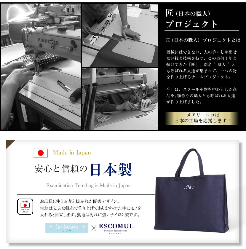 ↑日本製濃紺手提げバッグ(大)14,350円↑ ↑日本製濃紺バッグ(小)9,650円↑ メアリーココのお受験スーツ ブラックフォーマル・喪服等のフォーマルスーツ専門店 生地から縫製まですべての工程にこだわり、百貨店品質の高級喪服がリーズナブルな価格でお届けできます。 フォーマルスーツ専門店のお受験スーツは多くの方に好評いただいております。 豊富なデザイン・サイズ展開で、生地にはもちろんのこと、縫製・着心地・シルエットにこだわり、幼稚園受験・小学校受験・中学校受験と様々なシーンに合うデザインを撮り揃いえております。 20代の方からミセスの方まで幅広く対応しておりますので、必ず自分好みでお気に入りの一着に出会えます。 素材、織り方、高級感、雰囲気・・・見た目だけでなく着心地をよくする裏地、縫製技術。 大手生地商社、メアリーココ指定の縫製工場と協力しながら、高級感のある一着に仕上げています。 また、実際にご購入いただいたお客様からの声も取り入れておりますので、より機能性の高いお受験スーツ・濃紺スーツを取り揃えております。 サイズは、標準サイズ(5号,7号,9号,11号,13号,15号)、大きいサイズ(17号,19号,21号)、小柄サイズ(3号,5号,7号,9号,11号)と、 とても幅広く取り扱っておりますので、貴方にピッタリなお受験スーツに出会えます。 小柄サイズは、身長が低いママに補正なしで美しいラインが叶うデザインに♪プチサイズ、小さいサイズの方のお悩みを解消します! お受験用・濃紺スーツは立体縫製とのコラボレーションで存在感があります。 面接・学校見学・学校訪問・願書受け取り・授業参観にも最適です。 面接や学校訪問がある暑い時期には、ワンピースだけで参加できます。 卒園式、卒業式にも着用でき、コサージュを付けて入園式、入学式にも着用できるママスーツ。 女性にうれしい抗菌、消臭のデオドラントネーム付き! シンプルデザインなので、お宮参り、七五三、式典にも、ミセスの40代、60代の方にも・・あらゆる世代から愛されるフォーマルのデザインです。 また、お受験スリッパやお受験バック、A4対応お受験バッグも取り揃えております。 ヒール付きのお受験スリッパは美脚効果♪ 宝塚の華やかな大舞台で活躍した元タカラジェンヌと契約しフォーマルスーツの着心地、品質について意見をいただき、より良い商品の開発に努めています。 元タカラジェンヌも愛用のメアリーココのブラックフォーマル、是非手に取り商品の良さを実感いただきたいです。 【エスコミュール】お受験に!ル・ブラン!レッスンバッグ [学校行事][授業参観][お受験アイテム][学校説明会][学校見学会][幼稚園面接 服装]