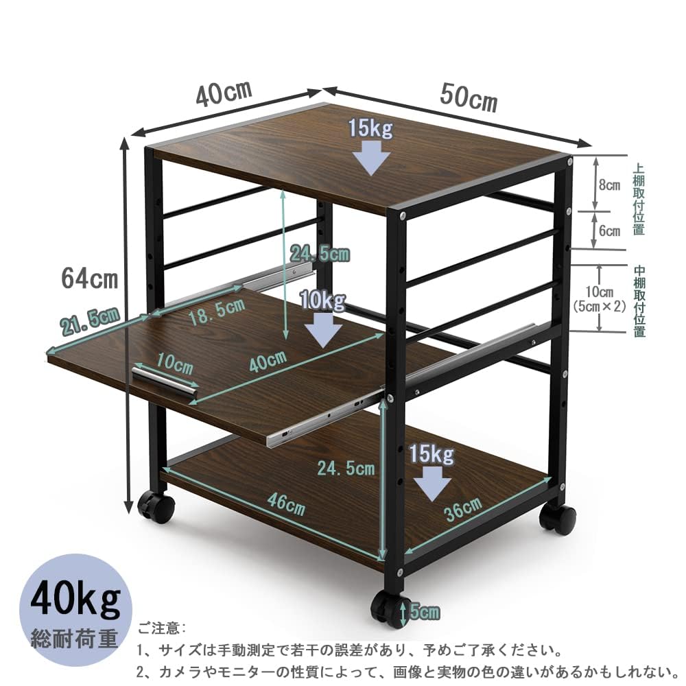 【商品詳細】 完成品サイズ:幅50×奥行き40×高さ64cm(キャスター付き) 静止耐荷重:上棚板・下棚板:約15kg、中棚板:約10kg 材質:パーティクルボード(メラミン化粧板・厚さ15mm)、フレーム(スチール・粉体塗装)、キャスター(プラスチック) 【中棚板スライド式&棚板高さ調節可能】 中棚板はスライド式で、取っ手付きだから出し入れもスムーズ! さらに上棚板・中棚板は3段階の高さ調整が可能で、収納物に合わせたアレンジができます。 【360°回転キャスター付きで移動ラクラク】 360°回転するキャスター付きで移動が簡単。 オフィスだけでなく、リビングやベッドサイドでも便利に使える万能タイプ。 【頑丈で高品質なメラミン化粧板】 天板や棚板にはメラミン化粧板を使用しており、 耐熱性・耐水性・耐摩耗性に優れているため、長く安心してお使いいただけます。 シンプルながらも機能性に優れた一台です。 ご注意:モニターの発色により実際と異なる場合があります。メーカー希望小売価格はメーカーサイトに基づいて掲載していますメーカー希望小売価格はメーカーサイトに基づいて掲載しています