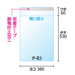 ◆商品説明 ・B3用のフタ付きOPP袋 標準タイプ1000枚入りです。 ・厚みは標準(#30)です。 ・B3サイズ(364x515ミリ)をスムーズに封入できます。 ・B3ポスターやフライヤー、DMを美しく見せ、洋服なども入る大型です。 ・帯電防止処理済だから、静電気でまとわり付きません。 規格表 寸法図 品番 T30-B3-10 フィルム厚み 30ミクロン 重量(1枚あたり) 約11.6g サイズ(mm)ヨコ×タテ+フタ 380×530+60 材質 OPP テープの位置 フタ テープの種類 密着テープ 包装形態 クラフト包装 製造国 日本 加工特徴の一覧 静電防止加工 サイドシール加工 他のセット 100枚1,000枚 ※この商品は宅配便にて発送いたします。 ※製品上、寸法・厚さに若干のバラつきがある場合がございます。 ※本製品は、原油価格の影響を受けるため、価格は予告なく変更される場合がございます。※密着テープは接着後、2,3日ではがれにくくなります。粘着力が強いため、開封時に破れることがあります。