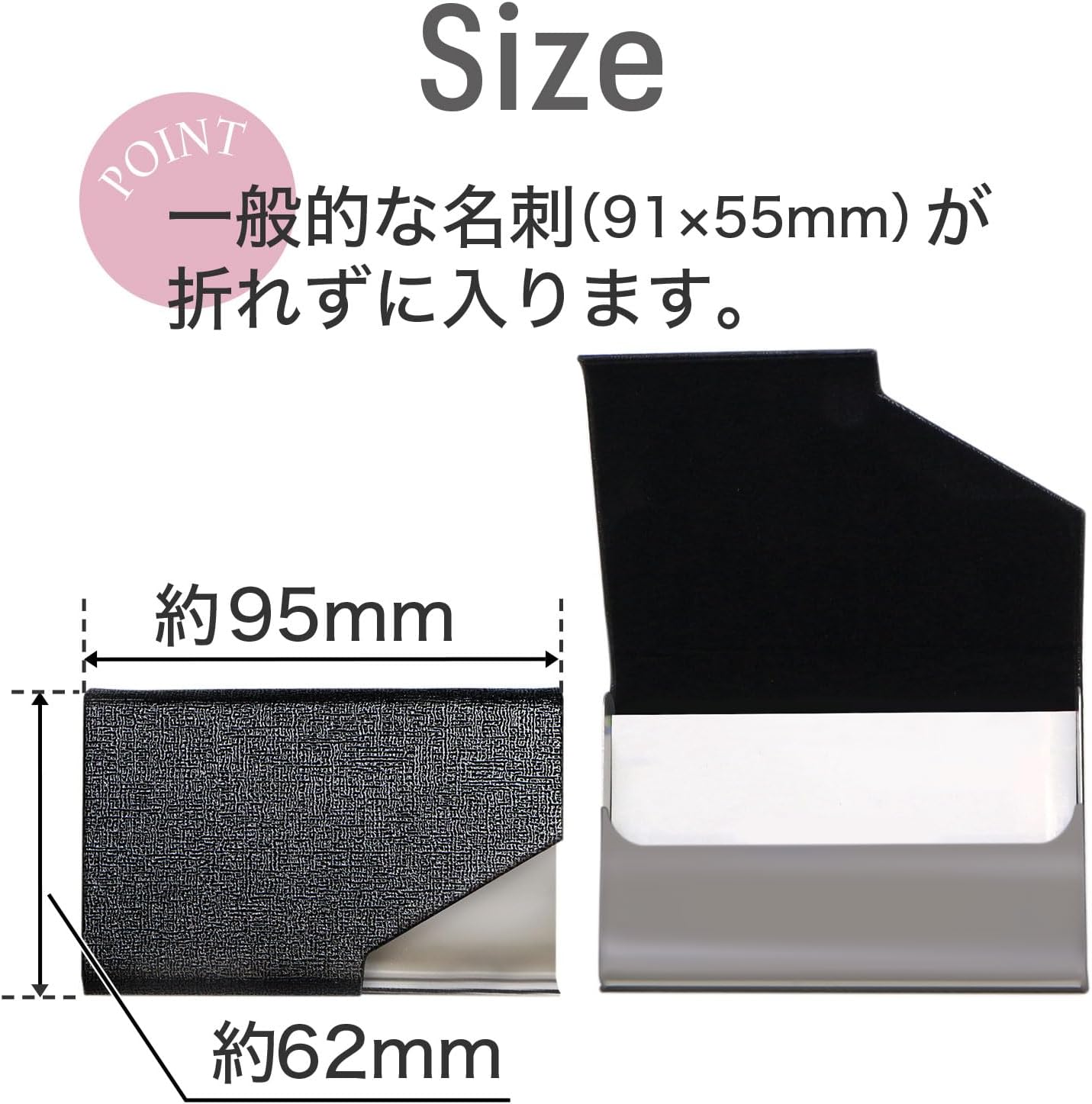 ●【ケースのサイズ】約95x62mm 重さ約69g 【収納できる名刺の目安サイズ】約91x55mm 【収納枚数】約30枚程度(カードの厚みによって前後します) ●【材質】金属・PUレザー ●【カラー】ブラック ●【特徴】ケースの内側に柔らかい素材を使用しています。フタ部分に磁石が付いているので、ぴったり閉じることができます。 ●表面が鏡面仕上げになっているので、身だしなみのチェックに便利です。金属製のため型崩れせず、必要な時に取り出しやすいです。■きらきらぷんぷん丸の名刺ケースとは? 一般的なサイズの名刺(約91x55mm)が折れずに入るケースです。 ケースの内側に柔らかい素材を使用しています。 フタ部分に磁石が付いているので、ぴったり閉じることができます。 表面が鏡面仕上げになっているので、身だしなみのチェックに便利です。 金属製のため型崩れせず、必要な時に取り出しやすいです。 レディース・メンズともに使いやすい、男女兼用のシンプルなデザインです。 ※当社販売製品の違法な類似品や模倣品に対しては、商標法・不正競争防止法など、その他法令に抵触する場合、弊社顧問弁護士と相談の上、民事・刑事の両面から厳正に対処致します。