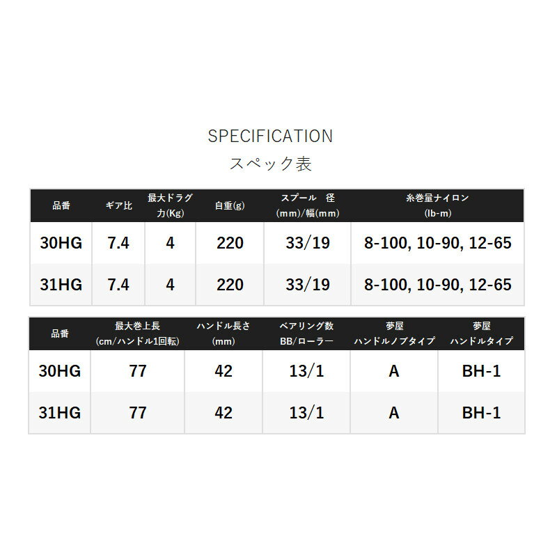 ●掲載商品は複数サイトおよび実店舗で併売しています。ご注文タイミングにより欠品し、お取り寄せにお時間を頂く場合やお手配が出来ずにやむを得ずキャンセルさせて頂く場合がございます。●商品画像は代表画像です。仕様変更により商品スペックやパッケージなど変更となる場合がございます。仕様変更に伴う返品、商品交換の際の往復送料はお客様ご負担となります。●店舗都合・お客様都合に依らずご注文内容の修正やキャンセルを行った際に在庫なしとなる場合やポイント、クーポンなど各種キャンペーンが適用外となる場合がございます。大変恐縮ながらこのような場合でも補填などは出来かねますのでご了承下さい。[シマノ ベイトリール]質実剛健な魅力から支持を集め続けているカルカッタコンクエスト。カルカッタコンクエストシャローエディションは、ナイロン8lb-100mキャパシティ、33/19mm MGLスプールIIIのシャロースプールを搭載。新たに搭載されたスプールはSVSインフィニティとの相性に優れ、特に軽量ルアーでピンポイントを撃ち抜く際のフィーリングはカルカッタコンクエストの質感の高さをさらに引き出します。インフィニティドライブとマイクロモジュールギア搭載による圧倒的な巻き上げ性能はもちろん健在。テクニカルなバスフィッシングゲームを極める釣り人に送る1台です。[CALCUTTA CONQUEST SHALLOW EDITION][24new02]サイズ:31HG自重:220gソルト対応/淡水専用:ソルト対応ギヤ比:7.4ベアリング数(本体):13ベアリング数(ローラー部):1ドラグ力:最大4kg巻き手:左専用糸巻量1:ナイロン(lb-m)8-100、10-90、12-65 巻上長(ハンドル1回転あたりの長さ):最大77cmスプール寸法:径33mm/幅19mmハンドル長さ:42mm夢屋ハンドルノブタイプ:A夢屋ハンドルタイプ:BH-1釣り方、フィールド:淡水ルアー代表対象魚:ブラックバス≪関連商品≫ 31HG MST-02-02-06 31HG