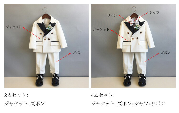 子供服 スーツ 男の子 4点セット(ジャケット+ズボン+シャツ+リボン) タキシード キッズ制服 ジュニア おしゃれ 長袖 ホワイト フォーマル スーツ イギリス風 男児 卒業式/入学式/発表会/結婚式 80-150CM