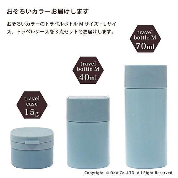 商品詳細 ※この商品は『トラベルボトル』と『トラベルケース』の3点セットです。 アイテム: トラベルケース 容量 : 約15g 品 質 : 容器 ポリエチレン、キャップ エラストマー 備 考 : 日本製 アイテム: トラベルボトル Mサイズ 容量 : 約40ml 品 質 : 容器 ポリエチレン、キャップ ポリエチレン 備 考 : 日本製 アイテム: トラベルボトル Lサイズ 容量 : 約70ml 品 質 : 容器 ポリエチレン、キャップ ポリエチレン 備 考 : 日本製 お取扱いとお洗濯について ●石油類・除光液・香水・酢(木酢液など)アルコール類を多量に含むものにはご使用できません。 ●フタが正しくしまっていないと漏れる恐れがあります。 ●火のそばに置かないでください。 ●たわし又はみがき粉でみがくとキズがつくことがあります。 ●強い衝撃を与えると破損する恐れがあります。 ●熱湯(70度以上)での洗浄や煮沸量毒はしないでください。 ●直射日光があたるところに置かないでください。 ●乳幼児の手の届かないところへ置いてください。 ●樹脂の特性上、ご使用される液体の成分によりボトル(本体・キャップ)が劣化破損する恐れがあります。液体の注意表記をよくご確認の上、ご使用ください。 ●用途以外にはご使用にならないでください。【商品詳細】 商品名/ LilleTOUR(リレッツァ)トラベルボトル&ケース3点セット カラー/ ピンク、ブルー、ホワイト 素 材/ 容器 ポリエチレン、キャップ エラストマー Made in Japan 友人宅へのお泊りも、突然の出張も、じっくり巡る旅にも。 使い心地のいいトラベルケースとトラベルボトル。 Lille TOUR トラベルケース、トラベルボトルは2016年度グッドデザイン賞を受賞しました。 使い心地にこだわって、丁寧な物づくりを評価していただきました。 審査委員の評価点 角の柔らかな四角い形状は、トラベルケース適した形である。手になじみ、収納しやすく、転がりにくい。 サイズによって蓋の開閉形式を変えるなど、使いやすさへの工夫にも妥協がない。 ニュートラルだが特徴的な色も美しい。市場にたくさんで回るトラベルケースの中にあっても、ひとつのスタンダードになり得る明快さと簡潔さを持ったデザインである。 開口部分がパカっと大きく開いて、スムーズに使えるトラベルケース。容量約15g、ボディクリームやヘア用ジェルの詰め替え、ピアスなどの小物の持ち運びにも 口が広いので、ケースの底まで指が届き、最後までスムーズにすくえます。本体とフタ部分が繋がっているので、慣れない旅先の洗面台でも、フタを転がしてしまったり、取り落とす心配がありません。 シャンプーやトリートメントのヘアケア用品、化粧水などの化粧品類を詰め替えて持ち運べるトラベルボトル。片手で簡単に開け閉め出来るので、濡れた手や旅先の狭いバスルームでも安定して使えます。 Mサイズは約40ml、Lサイズは約70ml入ります。セミロングヘアの場合、Mサイズだと3泊分の旅行に、Lサイズだと1週間分のシャンプーを持って行くのにちょうどいいサイズです。 詰め替え、使い終わった後の清掃が簡単なように、開口を広くつくりました。手軽に丸洗いできるので、急な出張や、思い立った旅行でも、素早く用意して持って行く事ができます。 中身が少なくなったら、キャップを下にして立てておくことができ、最後までスムーズに使えます。 化粧水、乳液、クリームなど、アイテムに合わせて選べるサイズとカラー。ポーチにきちんと収納できる、収まりのいい形。 ■トラベルケース ○乳液状や液状のものは入れないでください。○フタはしっかり閉めてご使用ください。○火のそばに置かないでください。○たわし又はみがき粉でみがくとキズがつくことがあります。○強い衝撃を与えると破損の原因となります。○熱湯(70℃以上)での洗浄や煮沸消毒はしないでください。○直射日光があたるところに置かないでください。○乳幼児の手の届かないところへ置いてください。○樹脂の特性上、ご使用される液体の成分によりボトル(本体・キャップ)が劣化破損する恐れがあります。液体の注意表記をよくご確認の上、ご使用ください。○用途以外にはご使用にならないでください。 ■トラベルケースボトル(Mサイズ/Lサイズ) ○石油類・除光液・香水・酢(木酢液など)アルコール類を多量に含むものにはご使用できません。○フタが正しく閉まっていないと漏れる恐れがあります。○火のそばに置かないでください。○たわし又はみがき粉でみがくとキズがつくことがあります。○強い衝撃を与えると破損の原因となります。○熱湯(70℃以上)での洗浄や煮沸消毒はしないでください。○直射日光があたるところに置かないでください。○乳幼児の手の届かないところへ置いてください。○樹脂の特性上、ご使用される液体の成分によりボトル(本体・キャップ)が劣化破損する恐れがあります。液体の注意表記をよくご確認の上、ご使用ください。○用途以外にはご使用にならないでください。
