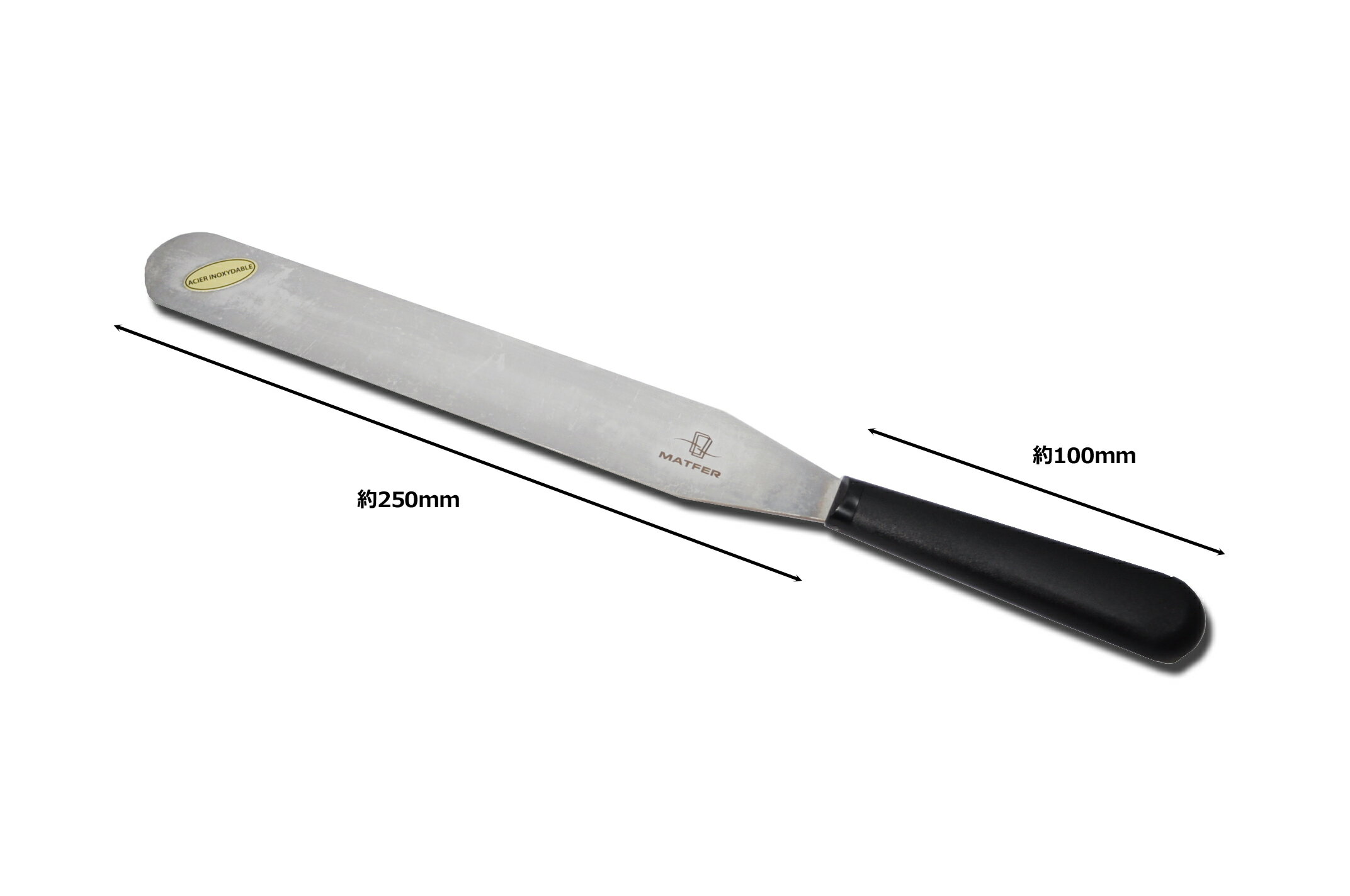 【MATFER shop】OUTLET SALE 【新品】MATFER パレットナイフ L250/PC柄 ※規格外商品です。製造ミスで本来無いサイズの 製品が輸入されてしまいました。製品のクオリ ティは変わりません。通常販売が出来ない為 OUTLETです。学生の皆様や若手パティシエ の方にお勧めです! 【スペック】 サイズ:刃渡り:L250mm / 柄:100mm 材 質:ステンレス/プラスチック製 ※OUTLET製品につき、返品交換はお受けできません。 ※食器洗浄機は不可。 ※手作りになりますので、若干の曲がりや歪みがある場合が ありますが、不良ではありません。ご理解下さいませ。