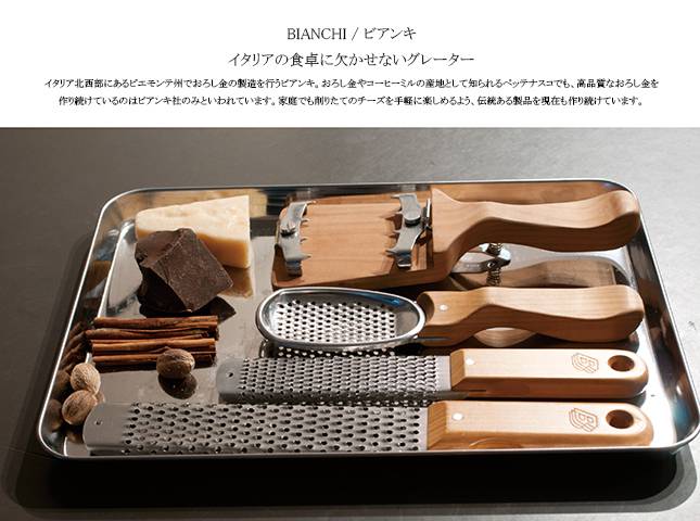 BIANCHI -ビアンキ- グレーター S 木製柄 グレーター(おろしがね)や、コーヒーミルの産地として名高い イタリア ピエモンテ州ペッテナスコにあるビアンキは、高品質なグレーターを作り続けているブランドです。 チェリー材を贅沢に使用したグレーターはぬくもりのあるデザインで、チーズ以外にも使える便利なアイテムをラインナップしています。 こちらはチーズだけではなく、ショウガなどのすり下ろしにも使える万能グレーターのSサイズです。 高品質なチェリーウッド材の風合いが優しいイタリア製のおろし金です。 キッチンに掛けておくだけでも存在感抜群ですね。 その他のグレーターシリーズはこちら 商品名 グレーター S(木製柄) ブランド BIANCHI ビアンキ 素材 チェリー(サクラ)、ステンレス サイズ W265xH37xD18mm カラー ステンレスシルバー、ブラウン 原産国 イタリア 備考 -