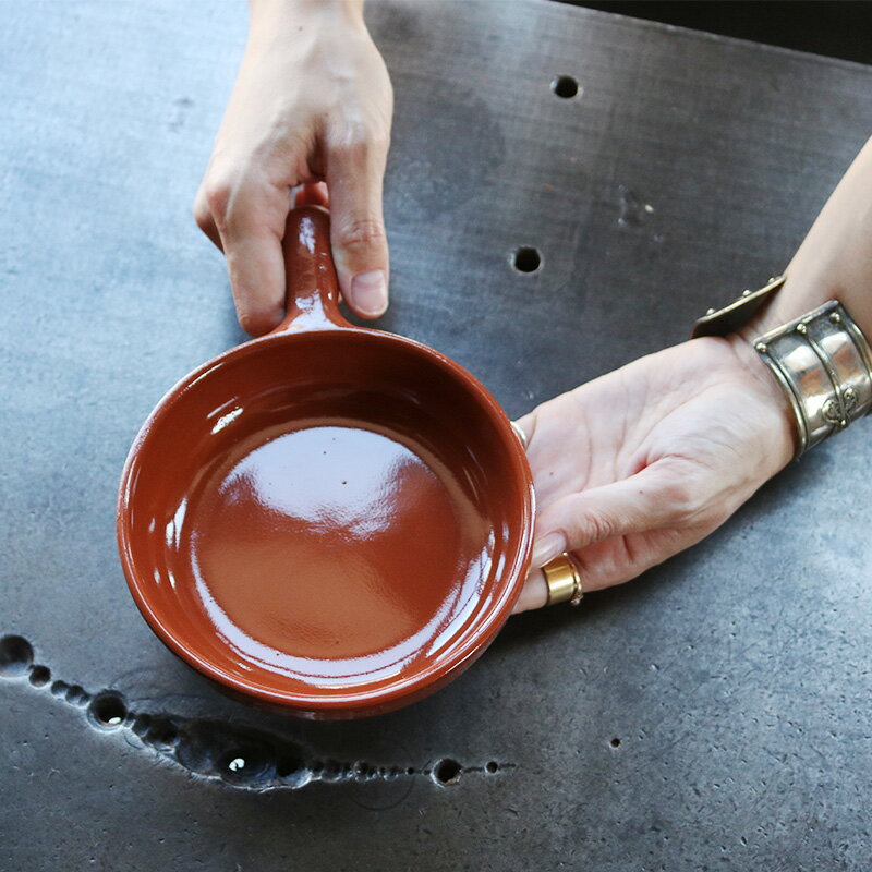 レガス パエリア 13 スープやアヒージョにグラタン。寒い季節の温まるお食事に。 おしりを濡らして、かるく振って水をきって、布巾の上にバウンドしてガスコンロへ。 にんにくを放り込んで、具材も放り込んで、オイルをかけて点火、弱火で放置。他の料理を作っている間にあっという間にアヒージョの出来上がり。 Regas / レガス 1821年創業。スペインで昔から陶芸の街として知られる、カタルーニャ州のブレダで200年以上にわたる間、カスエラと呼ばれるテラコッタ(素焼)の鍋やオーブンウエアを製造しているレガス社。 代表的な商品のカスエラはタパスと呼ばれる小皿料理の他、カスレやグラタンなどのオーブン料理やプリン、焼菓子などのスイーツにもご活用いただけます。 テラコッタの鍋や器は温かみのある素朴で独特な風合いが魅力なだけでなく、保温性に富み、お食事の間料理を温かい状態に保ちます。 下皿や鍋敷きにのせて レガスの裏面には釉薬がかかっていません。 この釉薬が無い部分、素焼きの状態でざらざらしています。 お料理の水分がまわって、しっとりすることもあるので、 食卓にだす際は、下皿や板(なべしき等)にのせてご使用になることをおすすめします。 直火にかける際の注意点 直火(弱火厳守)にかける際は、 火にあたる部分に水をかけて余分な水分を軽く拭いてから ガスにかけるようにしてください。 テラコッタの器の特徴 レガスはテラコッタの器です。 やわらかめな焼き物ですので扱いは優しくしてあげてください。 またラフな風合いの商品です。 イゴイゴしてるところや、わずかに釉薬がまわりきっていない箇所がある場合がございますが、良品となります。それぞれの個性としてお楽しみください。 その他のレガスシリーズ 商品名 レガス パエリア 13 ブランド Regas / レガス 材質 テラコッタ サイズ / 容量 W177 × D130 × H33(mm) / 満水容量:276cc 備考 ●対応器具:直火(弱火)、電子レンジ、オーブン、食洗機 ※IH(電磁調理器)は使用できません。 ※直火にかける場合は急激な温度変化を避け、弱火で調理してください。 ●使用上の注意 ・ご使用になる際は毎回、底の裏側の素焼部分を流水で湿らせてください。 ・直火の場合は弱火で加熱してください。 ・急激な加熱・急冷はしないでください。ヒビが入ったり割れる原因となります。 ・食材を入れたまま長時間放置しないでください。また調理したものは必ず下皿を敷いた状態でご提供ください。商品の性質上、オイルや水分が本体に染み込みやすい為、外側へ染み出す場合があります。 ・底が素焼きの為、水分が残りやすい器です。湿った状態や水分が中に残っているとカビの原因となりますので使用後は食洗機や手で洗い、よく乾燥させてください。手洗いの場合はオーブンで空焼きすることをお勧めします。 **底面部分の外側(素焼き部分)を洗剤を含んだスポンジなどで擦らないでください。 ・空焚きしないでください。 ●その他 ・製造工程上、釉薬のかかり具合のバラつき、表面のざらつきや小さな傷がある場合がございます。