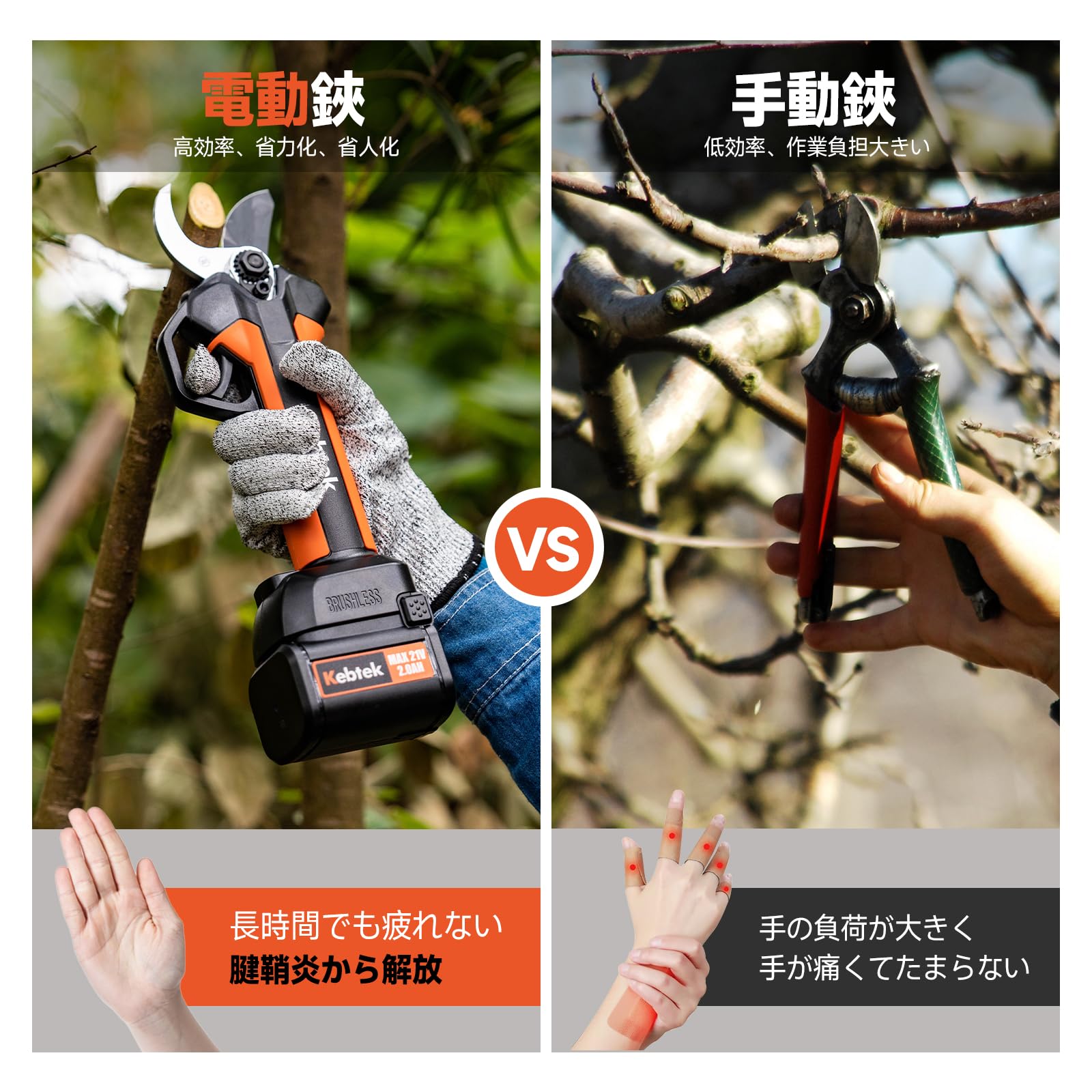 ・【33mm切断径、引金連動】:電動鋏KT 933は33mmの枝をスパスパ切れます。刃の開閉は引き金の引く強さでコントロールできますので、よりあんぜん、より繊細な剪定作業が実現できます。・【1個電池のみ、家庭用に十分】:この電気剪定鋏は大容量2000mAhの電池が1個のみ付属ですが、3-4時間連続作業できます。コードレスなので、外出作業は困ることがありません。庭木の剪定、竹や刈り枝の処理には十分です。腕、肩への負荷が小さく、剪定作業を楽にします。・【Kebtek互換4兄弟、軽量化1.0KG】:電動剪定鋏KT 9035、KT 940、KT E35とKT 933はポール、バッテリー、充電器互換できます。お客様の保管空間と負担を減らします。電動鋏KT 933はバッテリー装着時1.00KGです。ポール接続機種の中で軽いです。Kebtekの充電式剪定鋏には全部ブラシレスモーターを採用しています。負荷が掛かった時に、抵抗が感じるではなく、さらにもう一押しするような感じがあります。・【日本製フッ素刃、延長ポール別売り】:はさみの刃は日本製のSK5高炭素テフロン鋼から作られています。さらに非粘着性コーディングされました。スパスパ切れると同時に、枝の切断面がキレイ、木を傷めず健康的に保つことができます。別売りの高枝切りポールと接続すると、高枝の剪定も楽にできます。・【あんぜん装置付き】:誤操作による事故を防ぐために、電源スイッチをオンにした後、引金を2回すばやく引かないと刃が開かないように設定されています。Kebtekの電動工具は国家検定のあんぜん認証を取得済み、あんしんに使えます。バッテリーと充電器を1年間、本体を2年間保証致します。商品に関するご質問がございましたら、ぜひ連絡してください。24時間以内に対応致します。