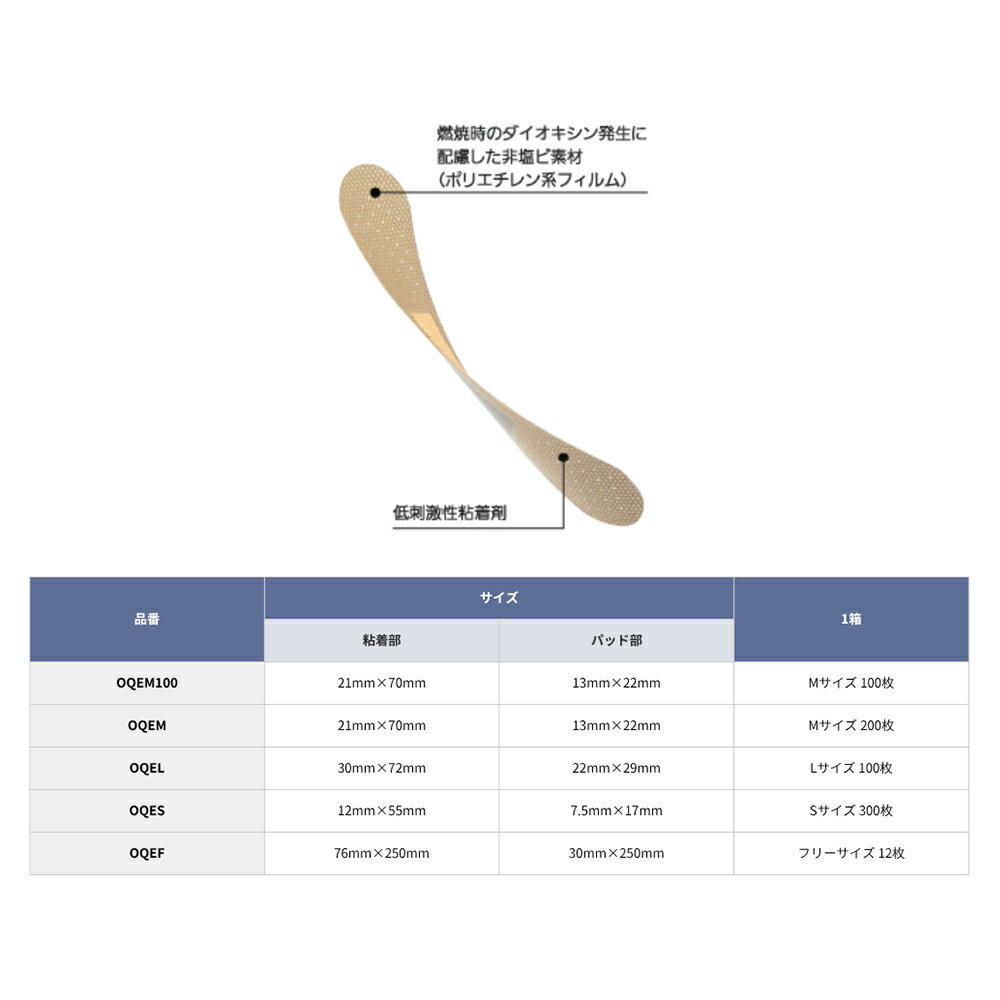 商品情報ポイント●ポリエチレン系素材の救急絆創膏●EOG滅菌済。 ●品番:OQEM100 ,規格:M ,詳細サイズ:《粘着部/パッド部》21×70mm/13×22mm ,入数:100枚 ●品番:OQEM ,規格:M ,詳細サイズ:《粘着部/パッド部》21×70mm/13×22mm ,入数:200枚 ●品番:OQEL ,規格:L ,詳細サイズ:《粘着部/パッド部》30mm×72mm/22mm×29mm ,入数:100枚 ●品番:OQES,規格:S ,詳細サイズ:《粘着部/パッド部》12mm×55mm/7.5mm×17mm ,入数:300枚 ●品番:OQEF,規格:F ,詳細サイズ:《粘着部/パッド部》76mm×250mm/30mm×250mm ,入数:12枚 一般医療機器認証・承認・届出番号:13B2X00218131160