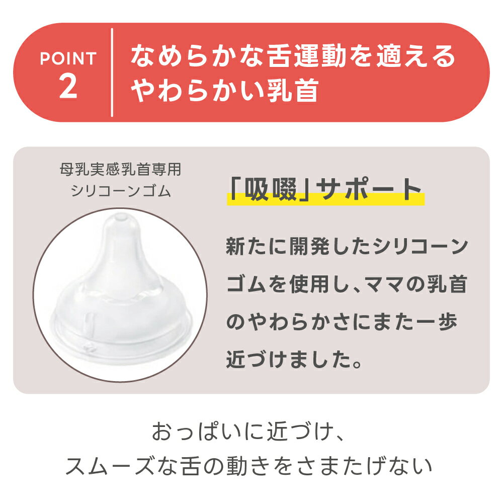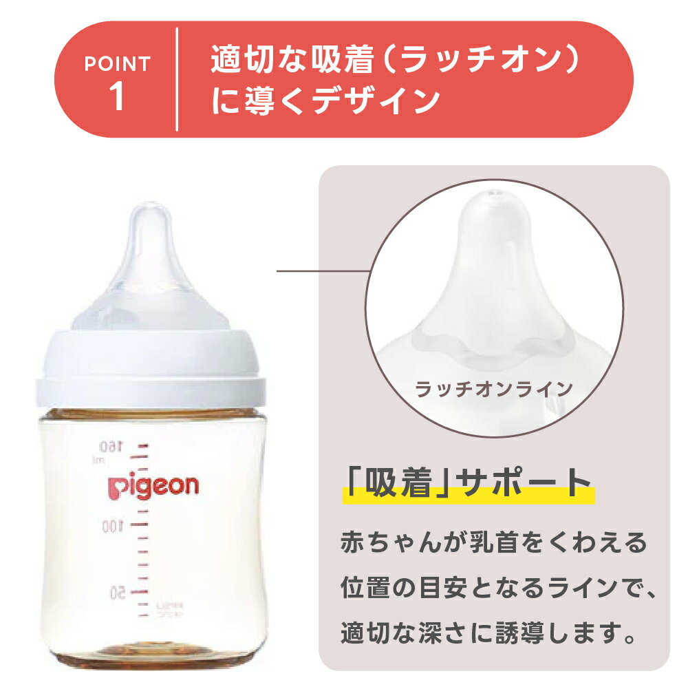商品情報ポイント●「おっぱいとの併用がスムーズであること」「おっぱいと同じ口の動きで飲めること」を目指して開発された「母乳実感」哺乳びんと乳首。●乳首をくわえる深さの目安となる「ラッチオンライン」があり、赤ちゃんの適切な吸着(ラッチオン)へ導き、スムーズな授乳をサポートします。●哺乳びんの乳首は、ママのおっぱいのような「やわらかさ」を実現するために、母乳実感乳首専用のシリコーンゴムを採用。●持ちやすい太さと調乳がしやすい広口ボトル。付属の乳首のサイズ160ml:SSサイズ(0ヵ月から)、吸い穴:丸穴240ml:Mサイズ(3ヵ月頃から)、吸い穴:Y字形消毒・除菌方法煮沸/スチーム:○レンジ:×薬液:○材質フード・キャップ:ポリプロピレン乳首:合成ゴム(シリコーンゴム)びん:ポリフェニルサルホン(PPSU)JANコード160ml:4902508024501240ml:4902508024518マツヨシ医療総合カタログコード:160ml:25-3703-01、240ml:25-3703-02ピジョン 母乳実感 哺乳びん プラスチック ミルク 授乳 哺乳瓶 乳首 ベビーグッズ 赤ちゃんグッズ ベビー用品 新生児 赤ちゃん あかちゃん 0歳 3ヶ月 丸穴 Y字形 助産院 産院 産婦人科 病院 産科 育児 ラッチオンライン ラッチオン 消毒 レンジ プラ