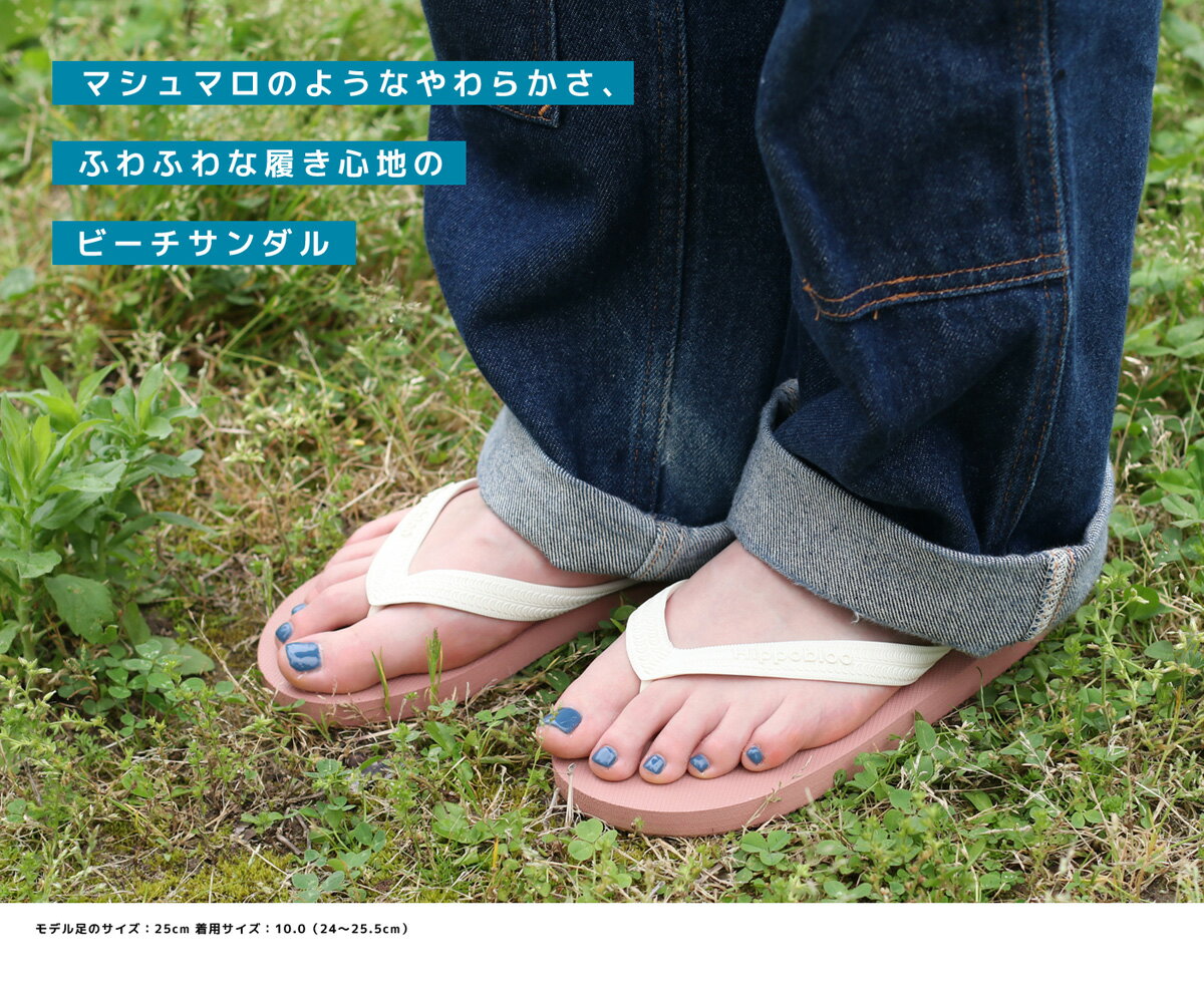 Product info Hippoblue(ヒッポブルー) ナチュラルラバービーチサンダル『世界で一番履き心地の良いサンダルを作りたい』という想いで生まれた1足。 タイで豊富に採れる天然ゴムを使ってふわふわ履き心地のビーチサンダルができました。 あなたの足だけでなく、地球環境にも作る人にも優しいのがHippobloo(ヒッポブルー)の魅力。 熱帯で採れる天然ゴムはもちろん『植物由来』で自然に生分解し、地球上のゴミを増やしません。 そして南国タイの小規模な工場でセミ・ハンドメイドで作られており、自然なフェアトレードを実践できています。 まずは履いていただくことをお勧めします! サイズ(cm)適応サイズ9.523~241024~25.510.526〜271127.5~281228.5~29 ブランド名 Hippoblue(ヒッポブルー) 品名ナチュラルラバービーチサンダル 生産国タイ 素材100% NATURAL RUBBER 洗濯表示なし Attention-注意事項- ※撮影時の照明等の影響やご覧になるモニターなどの環境によって、実物とは色合い等が異なって見える場合があります。予めご了承下さい。 ※2024年7月からの再入荷分より、付属の保存袋のプリントの柄が2種類混在しています。プリントの柄の指定は出来ませんので、予めご了承をお願い致します。 (西田:足の実寸25cm)サイズ10(24.5~25.5cm)でジャストサイズです。フットベット部分がとても柔らかく非常に履き心地の良いビーチサンダルです。海や川遊びする時に便利な1足です。ナチュラルラバービーチサンダル一度履いたらクセになる快適さと開放感。 夏の定番として手放せなくなる人が増えてきました。 ヒッポブルー(Hippobloo)はタイの良質な天然ゴムを使った植物由来のビーチサンダル。 履いたら分かるふわふわで弾力性あるソールの気持ちよさが一番の特長。 鼻緒(ストラップ)も天然ゴム製で足の指が痛くならない、歩き続けても疲れないビーチサンダルとして熱狂的なファンを増やしつつあります。 「ビーチサンダルは足が痛くなる」とご心配な方にこそおすすめしたい、足と地球環境にも優しいビーチサンダルです。
