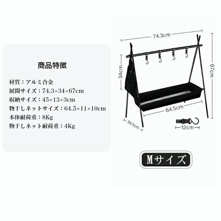 商品情報商品仕様材質:アルミニウム合金 本体サイズ:約74.3×34×67cm(展開)重量:約746g 本体耐荷重:8kg 物干しネット耐荷重:4kg セット内容:プラスチックフック×4 収納用ハンガー*1物干し ネット*1 収納テープ*2 食器収納袋*1 本体収納袋*1 (ご注意:もし欠品・不良品がございましたら、ぜひご連絡ください。早速代品を送らせていただきます。)商品特徴【組み立てEASY】高強度アルミニウム合金を採用し、メインポールの直径は1.9cm、サポートポールの直径は1.1cmで、高強度で耐久性を備えます。安定した三角構造でより良い安定性を提供し、耐荷重が10kgまで。ポールの接続部分に弾性ロープが接続されて、ポールを結び付くだけで簡単に組み立てられます。一体型で紛失防止可能で片付けも何も考えずポールを外して折りたたむだけで分解簡単。【機能性抜群】プラスチックのフックを4個も付属して独立に取り出しや移動可能。キャンプやバーベキューなどのアウトドア活動の時に、ランタンはもちろん、アウトドアランプ、ピクニック用品、タオルなどを掛けるのにお役に立てます。いざという時、家庭用の洗濯物の物干しとしても使用できます。また、収納用ハンガーと物干しネットが付属して、食器、小物、雑貨などもきちんと収納できます。【持ち運び便利】約44cmの専用の収納袋付き、簡単に折り畳んで、バックパックのポーチに詰めて保管出来ます。わずか746gで超軽量!収納や持ち運びに便利、子供でも楽に持ち上げます。場所を取らず小さく持ち運べるので、どんな場所にでも持っていけるアイテムです。【適用場所広い】キャンプ、バーベキュー、登山、お釣り、テント泊などのアウトドア活動に様々な道具が散乱して整理が大変の時に、このハンギングラックを使うと道具を簡単に整えてとても便利です。アウトドア活動など幅広く利用可能だけでなく、ご家庭で洗濯物を干す用のハンガーラックとして使用もできます。注意事項光の関係で、画像にわずかな色収差の問題が生じる可能性があります。ご容赦ください。手作り測定のため、1-2cmの誤差になっているかもしれないので、ご了承ください。商品によって弊社アマゾン倉庫から配送させて頂く場合があります。ハンギングラック キャンプ Mサイズ アウトドア ハンガーラック 軽量 アルミ 折りたたみ コンパクト 収納バッグ付き ツールハンガー ランタンハンガー 部屋干し 室内 アウトドア スポーツキャンプ ファミリーキャンプ キャンプ、登山、お釣り、テント泊などのアウトドア活動に様々な道具が散乱して整理が大変の時に、このハンギングラックを使うと道具を簡単に整えてとても便利です。 2