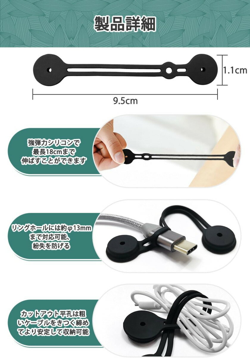 商品情報【商品情報】本体サイズ:9.5*1.1*0.4 磁石サイズ:φ1.1 重さ:4.6g カラー:ブラック 内容:10本入り【商品特徴】【高品質素材】本体は高弾性シリコン素材で最長18 まで伸ばせます。様々な太さのケーブルまたは複数のコードに適用して脱落しにくい。摩擦や引っ張りに強く、汚れたら丸洗いもできるため繰り返し使用可能。ハサミやキーホルダーなどをしっかりホールドできる二つの強力磁石がシリコンに包まれ、マグネットが飛び出さない。【使用簡単】磁石で止めるので細いケーブルを簡単に整理可能。もし複数のコードや食べかけお菓子袋などを収納したいなら、リングホールとカットアウト平孔を組み合わせて利用すればきつく締めて収納できます。マグネットデザインはより良い安定性や便利性を提供し、使用範囲が広く、冷蔵庫、黒板、ホワイトボードなどに使えます【コンパクト】本体は柔らかく、鋭いエッジなどがないので、収納したい物を破損する心配は一切なく。わずか4.6gで持ち歩きにも便利で、黒い色で目立たない。日常生活に対してまさに便利な一品です。【多用途】ごちゃごちゃなケーブルの整理だけではなく、コイン、しおり、写真、付箋を挟んたり、キーリング、食品袋止め、マグネットなどとして使える。アイデアによってまさに使用方法は無限大。ぜひ皆様オリジナルの使い方を探してみてください。注意事項1.色がある場合、モニターの発色の具合によって実際のものと色が異なる場合がある。2.商品によって弊社 アマゾン 倉庫から配送させて頂く場合があります。【進化版デザイン】MAVEEK 強磁力 マグネットクリップ 紛失防止 カットアウト デザイン 新型 磁石 シリコン ケーブルクリップ きつく締める 結束バンド ケーブルタイ 多用途 コード 収納 巻き取り 10個入り φ13mmまで対応可能のリングホールとカットアウトデザインで旧版よりケーブルをよりきつく収納可能。 2