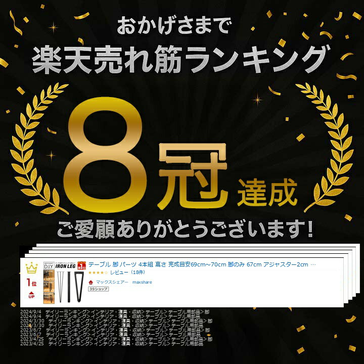 ※[店舗管理用 URL]a18669※[品番] a18669 a18715 a07100 お好きな木材で簡単D.I.Y. テーブル用アイアンレッグ 流行りのD.I.Y.が手軽にできるテーブル用のアイアンレッグです。お好きな木材で作った天板を載せればオリジナルテーブルの出来上がりです。 選べる3つのデザイン アイアンレッグのデザインは、トライレッグ、スクエアレッグ、プレートレッグの3タイプ。レッグ表面はマットな質感でシックで落ち着いたデザインに。 ガタつきを防止! アジャスター付属 付属のアジャスターでテーブルのガタつきを 調節することができます。また床の傷防止や滑り止めとしても有効です。 安心・安全の品質 国内にて試験実施済み 本製品は日本国内の検査機関にて耐荷重試験(破壊)を実施し、約450kgfをクリアした安全な製品です。 ※耐荷重にてのご注意※ 試験は脚のみになります。天板に関しては素材や大きさ、厚み等によって異なりますのでご注意ください。 その他のスペック ・落ち着きのある マットな質感 ・6mmトラスタッピングネジを ご用意ください [こんな商品をお探しの方に] テーブル デスク スチール脚 アイアン脚 パーツ 角 四角 スクエア テーブル脚 デスク脚 自作 DIY D.I.Y ホームセンター 交換 リメイク カスタム オリジナル 手作り 改造 取り付け かんたん 簡単 アイデア テーブル天板 天板 アイアン アンティーク センターテーブル リビングテーブル ダイニングテーブル ソファテーブル ソファーテーブル 応接テーブル ガラステーブル 座卓テーブル 座卓 棚付きテーブル 棚付きローテーブル 収納付きテーブル table 長机 勉強机 PCデスク パソコンデスク ノートパソコンデスク 机 つくえ 文机 パソコン机 作業台 インテリア 部屋 模様替え 引越し 新生活 一人暮らし ひとり暮らし シングルライフ 単身赴任 和室 洋室 リビング 応接 オフィス ワンルーム 長方形テーブル 長テーブルシンプル 北欧 アジアン ナチュラル モダン スタイリッシュ インダストリアル レトロ ビンテージ 西海岸 ヴィンテージ ブルックリン ミッドセンチュリー アーバンスタイル アメリカンスタイル おしゃれ オシャレ お洒落テーブル ハンドメイド ルームツアー デスクツアー ガジェット インテリア・寝具・収納 テーブル用部品 脚商品詳細 タイプ: ・トライレッグ×4 ・スクエアレッグ×4 ・プレートレッグ×4 サイズ: トライレッグ : (約)幅14cm×奥行14cm×高さ67cm スクエアレッグ : (約)幅10cm×奥行10cm×高さ67cm プレートレッグ:(約)幅16cm×奥行16cm×高さ67cm ※アジャスターは+2cm程度で微調整可能 材質: スチール 重量: トライレッグ : (約)4kg スクエアレッグ : (約)7.2kg プレートレッグ:(約)8.8kg ※4本分 対応ネジ: 6mmトラスタッピングネジ ネジ取付箇所の厚み: 3mm 必要なネジの本数: トライレッグ : 12本 スクエアレッグ : 16本 特記事項: ※天板・ネジは付属しません。 ※本製品とそこに乗せる天板の厚みを考慮した長さのネジをご用意ください。 ※天板に下穴を開けてからネジを取り付けてください。 ※天板の素材や大きさ・厚み等によって耐荷重は異なります。 ※天板の素材や大きさ・厚み等によって耐荷重は異なります。 MADE IN CHINA ※商品は、モニターによって色合いが異なって見える場合があります。 また、仕様・デザインは改良のため予告なく変更することがあります。 お好きな木材で簡単D.I.Y. テーブル用アイアンレッグ 流行りのD.I.Y.が手軽にできるテーブル用のアイアンレッグです。お好きな木材で作った天板を載せればオリジナルテーブルの出来上がりです。 選べる3つのデザイン アイアンレッグのデザインは、トライレッグ、スクエアレッグ、プレートレッグの3タイプ。レッグ表面はマットな質感でシックで落ち着いたデザインに。 ガタつきを防止! アジャスター付属 付属のアジャスターでテーブルのガタつきを 調節することができます。また床の傷防止や滑り止めとしても有効です。 安心・安全の品質 国内にて試験実施済み 本製品は日本国内の検査機関にて耐荷重試験(破壊)を実施し、約450kgfをクリアした安全な製品です。 ※耐荷重にてのご注意※ 試験は脚のみになります。天板に関しては素材や大きさ、厚み等によって異なりますのでご注意ください。 その他のスペック ・落ち着きのある マットな質感 ・6mmトラスタッピングネジを ご用意ください [こんな商品をお探しの方に] テーブル デスク スチール脚 アイアン脚 パーツ 角 四角 スクエア テーブル脚 デスク脚 自作 DIY D.I.Y ホームセンター 交換 リメイク カスタム オリジナル 手作り 改造 取り付け かんたん 簡単 アイデア テーブル天板 天板 アイアン アンティーク センターテーブル リビングテーブル ダイニングテーブル ソファテーブル ソファーテーブル 応接テーブル ガラステーブル 座卓テーブル 座卓 棚付きテーブル 棚付きローテーブル 収納付きテーブル table 長机 勉強机 PCデスク パソコンデスク ノートパソコンデスク 机 つくえ 文机 パソコン机 作業台 インテリア 部屋 模様替え 引越