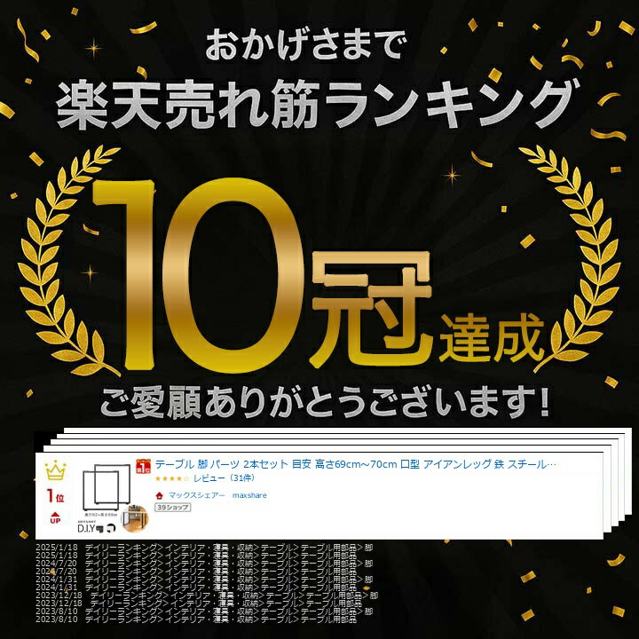 お問合せはこちら ※[店舗管理用 URL]a18821※[品番]【ブラック2本セット:a18821】【ホワイト2本セット:a19464】 お好きな木材で簡単D.I.Y. テーブル用アイアンレッグ登場 流行りのD.I.Y.が手軽にできる テーブル用のアイアンレッグが登場しました。 お好きな木材で作った天板を載せれば オリジナルテーブルの出来上がりです。 ※天板・ネジは付属しません。 大きめ天板も載せやすい 奥行62cmの大型レッグ ベーシックな口型デザインで主張し過ぎず 合わせる天板を選びません。 ガタつきを防止! アジャスター付属 付属のアジャスターでテーブルのガタつきを 調節することができます。 また床の傷防止や滑り止めとしても有効です。 [こんな商品をお探しの方に] テーブル 脚 スチール脚 アイアン脚 パーツ 角 四角 スクエア テーブル脚 自作 DIY D.I.Y ホームセンター 交換 リメイク カスタム 手作り 改造 取り付け かんたん 簡単 アイデア テーブル天板 天板 アイアン アンティーク センターテーブル リビングテーブル ダイニングテーブル ソファテーブル ソファーテーブル 応接テーブル ガラステーブル 座卓テーブル 棚付きテーブル 棚付きローテーブル 収納付きテーブル table 長机 勉強机 デスク PCデスク パソコンデスク ノートパソコンデスク 机 つくえ 文机 パソコン机 作業台 インテリア 部屋 模様替え 引越し 新生活 一人暮らし ひとり暮らし シングルライフ 単身赴任 和室 洋室 リビング 応接 オフィス ワンルーム 長方形テーブル 長テーブルシンプル 北欧 アジアン ナチュラル モダン スタイリッシュ インダストリアル レトロ ビンテージ 西海岸 アンティーク ヴィンテージ ブルックリン ミッドセンチュリー アーバンスタイル アメリカンスタイル ミッドセンチュリー おしゃれ オシャレ お洒落 インテリア・寝具・収納 テーブル テーブル用部品 脚 テレワーク 在宅ワーク 在宅勤務 リモートワーク 巣ごもり 外出自粛 在宅太り商品詳細 カラー: ・ブラック ・ホワイト サイズ: (約)幅10cm×奥行62cm×高さ69cm 材質: スチール 重量: (約)9.3kg ※2本分 対応ネジ: 6mmトラスタッピングネジ ネジ取付箇所の厚み: 5mm 必要なネジの本数: 16本 特記事項: ※天板・ネジは付属しません。 ※本製品とそこに載せる天板の厚みを考慮した長さのネジをご用意ください。 ※天板に下穴を開けてからネジを取り付けてください。 ※天板の素材や大きさ・厚み等によって耐荷重は異なります。 MADE IN CHINA ※商品は、モニターによって色合いが異なって見える場合があります。 また、仕様・デザインは改良のため予告なく変更することがあります。 お好きな木材で簡単D.I.Y. テーブル用アイアンレッグ登場 流行りのD.I.Y.が手軽にできる テーブル用のアイアンレッグが登場しました。 お好きな木材で作った天板を載せれば オリジナルテーブルの出来上がりです。 ※天板・ネジは付属しません。 大きめ天板も載せやすい 奥行62cmの大型レッグ ベーシックな口型デザインで主張し過ぎず 合わせる天板を選びません。 ガタつきを防止! アジャスター付属 付属のアジャスターでテーブルのガタつきを 調節することができます。 また床の傷防止や滑り止めとしても有効です。 [こんな商品をお探しの方に] テーブル 脚 スチール脚 アイアン脚 パーツ 角 四角 スクエア テーブル脚 自作 DIY D.I.Y ホームセンター 交換 リメイク カスタム 手作り 改造 取り付け かんたん 簡単 アイデア テーブル天板 天板 アイアン アンティーク センターテーブル リビングテーブル ダイニングテーブル ソファテーブル ソファーテーブル 応接テーブル ガラステーブル 座卓テーブル 棚付きテーブル 棚付きローテーブル 収納付きテーブル table 長机 勉強机 デスク PCデスク パソコンデスク ノートパソコンデスク 机 つくえ 文机 パソコン机 作業台 インテリア 部屋 模様替え 引越し 新生活 一人暮らし ひとり暮らし シングルライフ 単身赴任 和室 洋室 リビング 応接 オフィス ワンルーム 長方形テーブル 長テーブルシンプル 北欧 アジアン ナチュラル モダン スタイリッシュ インダストリアル レトロ ビンテージ 西海岸 アンティーク ヴィンテージ ブルックリン ミッドセンチュリー アーバンスタイル アメリカンスタイル ミッドセンチュリー おしゃれ オシャレ お洒落 インテリア・寝具・収納 テーブル テーブル用部品 脚 テレワーク 在宅ワーク 在宅勤務 リモートワーク 巣ごもり 外出自粛 在宅太り
