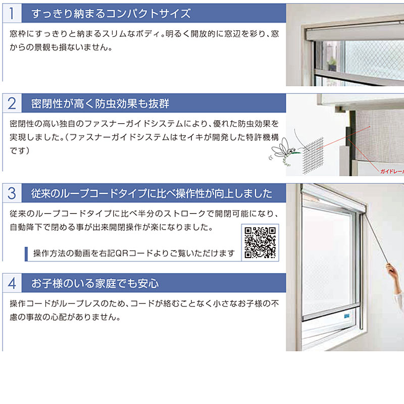 【ご注意ください】オーダー網戸はサイズにより価格が変わります。また、価格に合わせて買い物かごを用意しております。お買い物になる前に商品タイトル内にあるサイズを確認の上、合致したカートからお買い求めください。カート違いの場合は、当方で金額修正とさせていただきます。 収納時は上部にスッキリと納まるシンプルな網戸です。 眺望性の優れたロールアップ網戸が、窓から心地よい風を取り入れます。ロールアップ網戸とは、ブラインドのように上部のボックスにネット(防虫網)が収納される網戸のことです。ネットは上部に巻き上げられて収納されるので、使わない季節は網戸の存在を感じさせません。開閉操作は、1本のチェーンコードで上げ下げ開閉操作をするループレスタイプのため、小さなお子様がいたずらをして事故につながる心配がございません。従来のループタイプに比べ軽くスムーズな開閉が可能です。 特許機構のガイドレールシステムを採用しているので、抜群の防虫性能を実現しています。 設置方法(枠内設置=Gタイプ、片側枠内+片側正面設置=SG/GSタイプ、正面設置=Sタイプ=別カート)により採寸方法が変わりますので、ご注意ください。 【採寸について】 こちらの商品の特性上、採寸等の間違いがあっても、返品・交換が出来ません。サイズの間違いがないよう採寸をお願い致します。 ※この商品は、大型貨物扱いになるため、以下の内容についてご承知ください。 ・業務用運送便のため、日祝でのお届け、時間指定はお受けできません。ご不在の場合は不在票を頼りに、運送会社と直接対応お願いします。 北海道、沖縄県その他離島には別途送料がかかることがあります。該当の場合、受注後に金額をご相談させていただきます。