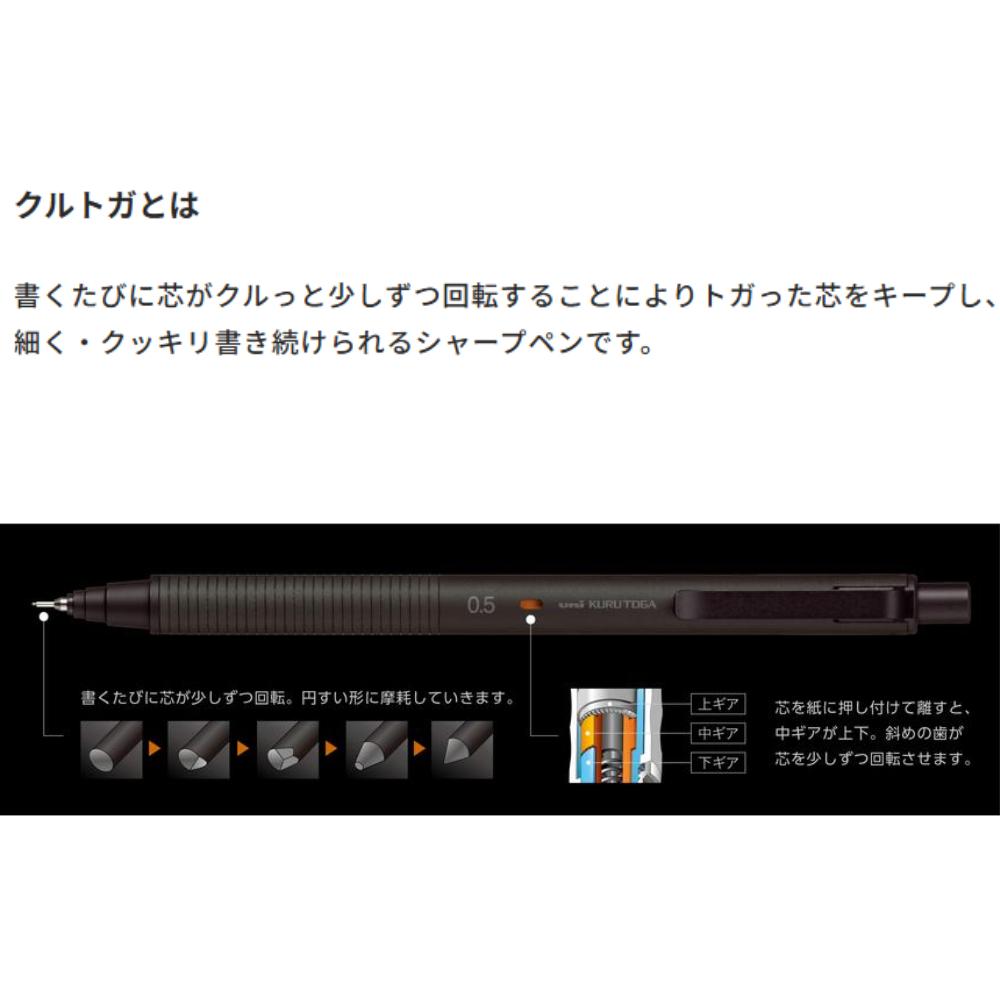 商品情報クルトガメタル クルトガの機能はそのままに、安定した筆記感を生み出すメタルボディ。 芯が回ってトガり続ける特長はそのままに、 安定した書き味と軸の表層にもこだわったメタル製のクルトガです。 ●ボディ全体にブラスト処理を施すことで、落ち着きのある上質な質感 を演出。軽量性を兼ね備えたアルミ素材を使用し、長く使っても疲れにくい。 ●グリップには、ブラスト処理に加え、細かい引き目を入れることで、握りやすさとデザイン性を両立。手に馴染むマイルドエッジグリップ加工。 ●クルトガ最高峰モデル「KURUTOGA DIVE」のDNAを引き継いだ板状の金属クリップ。 書き味へのこだわり ●ペン先の動きを最小限に抑えたクルトガエンジンを搭載。 ●ペン先に筆記時の衝撃を和らげる樹脂製パーツ「ニブダンパー」を搭載。ペン先の動きを感じにくく、安定した書き味を実現。商品詳細サイズ:軸径9.5×奥行13.4×高さ145.8 mm 材質:真鍮, アルミニウム, 鋼材 芯径:0.5mm カラー:サイレントブルー(品番M5KH1P.10) ファントムグレー(品番M5KH1P.23) ノクターンブラック(品番M5KH1P.24)注意事項商品の仕様は予告なく変更になる場合がございます。 ※お使いのモニター環境や、撮影場所やイメージにより 実際の商品と色味が若干異なる場合がございます。