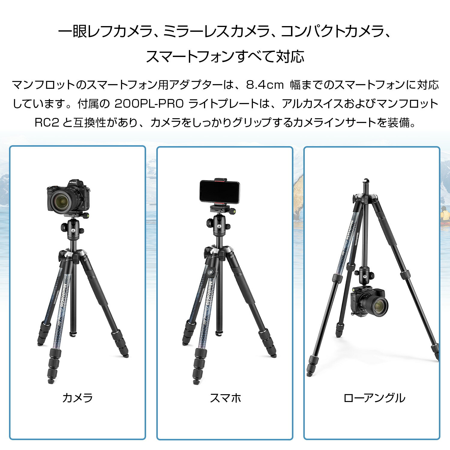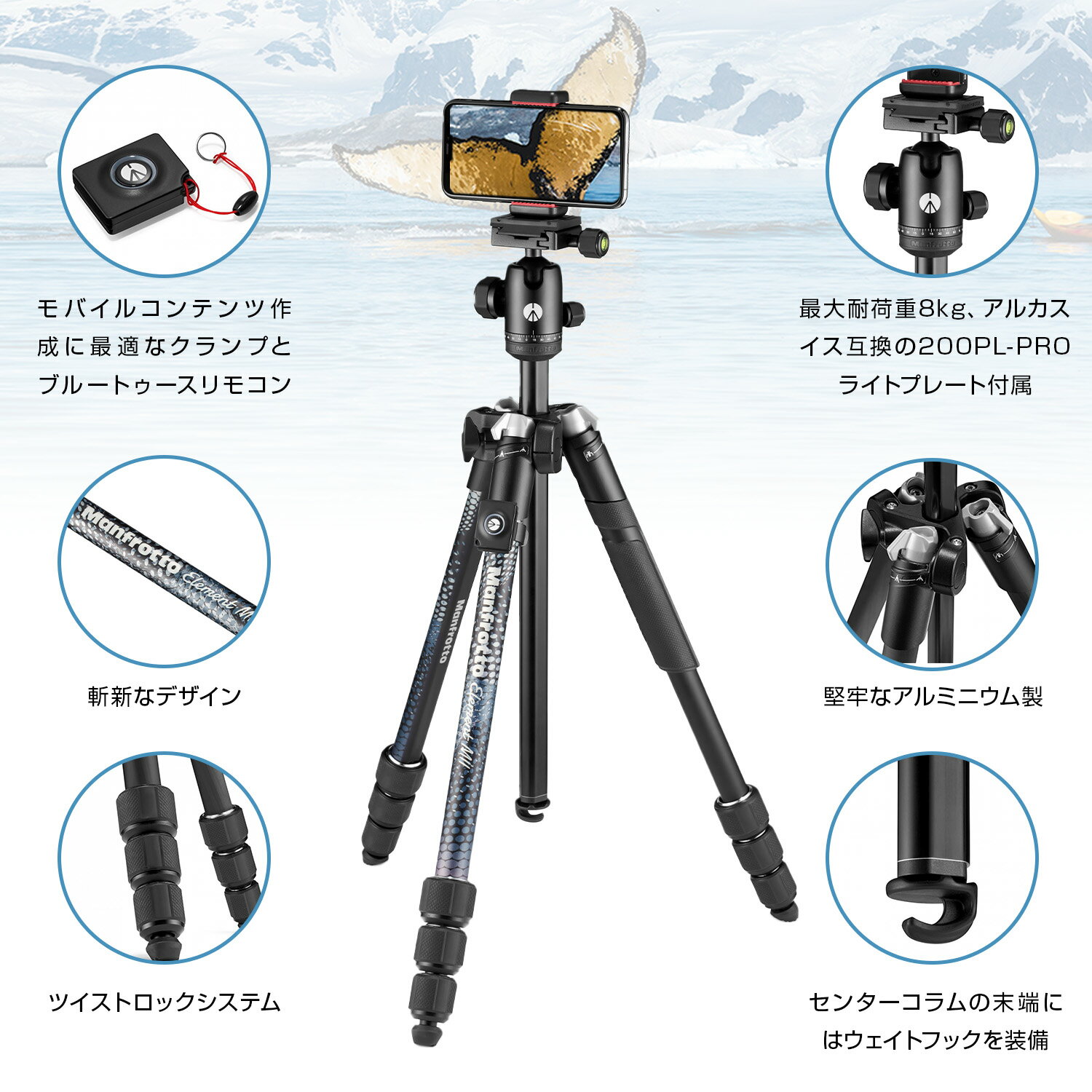 OUTLET: パッケージ不良や生産完了品などの未使用品。1年間製品の基本保証あり。マンフロット Element MII アルミニウム4段三脚MBTキットBKは、カメラだけでなくスマートフォンでの撮影にも対応したトラベル三脚キットです。 『Element ビッグ』シリーズの二世代目となる『Element MII』三脚シリーズの名称には、MADE IN ITALYとMARK2の二つの意味が込められており、品質や機能がさらに進化しています。個性を主張するスタイリッシュなデザインをはじめ、いくつものアップグレードと新機能が搭載されています。また、マンフロットのスマートフォン用アダプターとBluetoothリモートコントロールが付属しており、8.4cm幅までのスマートフォンを装着することが可能です。Bluetooth®認証のリモートコントロールは専用アプリ不要のシングルボタン式シンプル構造で、最大で27.5mのリモートシャッターが可能です。 三脚は、コンパクトで軽量。信頼性が高く、自由な創造性を刺激する優れた構造と機能を備えています。アルミニウム製のスパイダーに開脚角度セレクターを巧みに収容するデザインとすることで、三脚サイズの小型化が図られており、最大伸高160cmでありながら、縮長は42.5cm、自重はわずか1.55kgと軽量です。最大耐荷重は8kgと、大きくて重量のあるズームレンズも安心して使用することができます。開脚角度セレクターと人間工学を採り入れたツイストロックシステムにより、即座にセットアップを完了して撮影に臨むことができます。また、センターコラムの末端にはウェイトフックを装備しているため、必要に応じてウェイトを追加することができます。 アルミニウム製のボール雲台はスムーズなフレーミングが可能であり、ロックも確実です。ボールロック用の大型ノブとは別に、パンロック用の小型ノブを独立させたデュアルロックシステムを採用しています。付属のテクノポリマー製200PL-PROライトプレートは、アルカスイスおよびマンフロットRC2と互換性があり、カメラをしっかりとグリップするラバーインサートを装備しています。 パッド入りのキャリングバッグが付属しており、どこへでも快適に持ち運ぶことができます。 全伸高160cm 格納高42.5cm 雲台タイプボール雲台 最大耐荷重8kg 全伸高(センターポールを伸ばさない状態)132cm ベース側直径40 センターポールラピッド カラー黒 脚段数4 最上部アタッチメント1/4″ ネジ ベースタイプ40 Easy LinkNo フリクションコントロールなし フロントティルト+90°/-38° 最低高43cm ボールロックあり 側方ティルト+90°/-38° 脚タイプシングル コーナーガンバ25°, 35° 脚ロックタイプツイストロック 脚チューブ直径12, 15.5, 19, 22.5 素材アルミ 最高使用温度70 最低使用温度-30 パンドラッグなし プレートタイプ200LT-PL-PRO クイックリリースあり ティルトドラッグなし