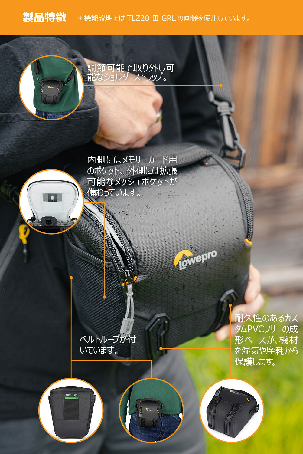 OUTLET: パッケージ不良や生産完了品などの未使用品。1年間製品の基本保証あり。Loweproの人気コレクションAdventuraがLoweproのグリーンラインにリニューアルされ、リサイクル素材とSolution dyedで生成された生地を使用するようになりました。 最新の Adventura III はコンパクトなパッケージで機材を保護し、いつもアドベンチャー(撮影)のサポートをします。 TLZ20は、Fujifilm XT200、Canon M50 MII、EOS R10、Nikon Z50 などのキットレンズを備えたミラーレスカメラに最適に設計されています。メモリー カードやその他のカメラ アクセサリーや機器を収納できるポケットがあり、ベルト ループと取り外し可能なショルダー ストラップを備え、使いやすさと実用性を高めています。 耐久性のある"PVCを使用しない"樹脂で成型されたベースが機材を湿気、摩耗、衝撃から保護し、環境にも配慮しています。写真撮影の必需品をすべて収納できる小さなカメラバッグ。 水資源と環境への悪影響を減らし、環境保全に貢献するグリーンライン製品であるTLZ20には、84% の、リサイクル素材とSolution dyedで生成された生地が使用されています。 61% のリサイクル生地で構成されていて、すべての生地、ウェビング、バインディング、ジッパーテープ、コード、メッシュが含まれ、各バッグの製造に使用されるSolution dyedで生成された生地が 23%含まれています。(このグリーンラインのスコアは、GRI 301-2規格に従って測定した再生材含有量は、使用した再生糸の割合としての全糸使用量に占める重量。) TLZ 20 は 、カメラとレンズをしっかりと保護し、大きなバッグでの収納や滑り止め付きの取り外し可能なショルダーストラップや一体型のベルトループを使用して携帯することができます。 耐久性のある"PVCを使用しない"樹脂で成型されたベースが機材を湿気、摩耗、衝撃から保護します。カラー黒Total Volume2Color Main黒内寸13.5 x 9 x 13 cm外寸17 x 12 x 19 cmカメラ収納ケース13.5 x 9 x 13 cmFeaturesWater Resistant,Shoulder StrapFitsLens,Standard MirrorlessCameraDevice Volume2Exterior Material600D polyesterInterior Material200D polyester
