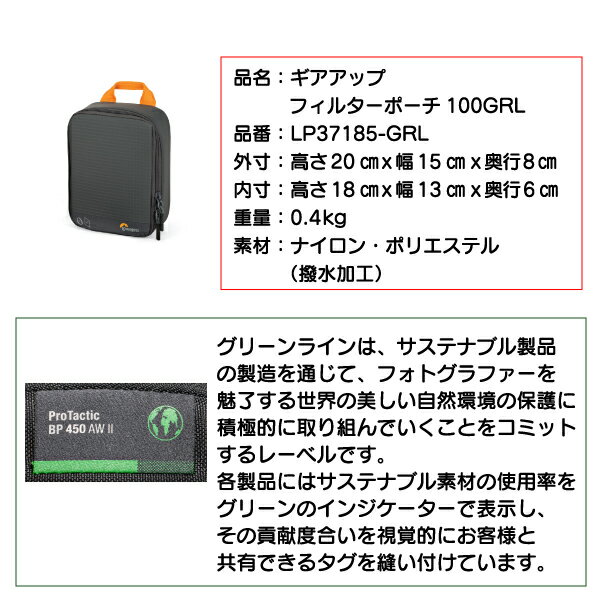 OUTLET: パッケージ不良や生産完了品などの未使用品。1年間製品の基本保証あり。ギアアップ フィルターポーチ 100 GRLには、ラウンドフィルターとシートフィルターに加えてフィルターマウントが収納できます。各シートフィルターは、フィルターマウント用の専用外部ポケットを備えた傷のないカードスリーブで保護されています。 ギアアップ フィルターポーチ 100 GRLは、グリーンライン プロジェクトを通じてサステナビリティ推進に向けた Lowepro の取り組みの一環であり、環境への悪影響を軽減するために77%のリサイクル素材(すべての生地、ウェビング、バインディング、ジッパーテープ、コード、メッシュを含む)でリニューアルしました。 (このグリーン ラインスコアは、GRI 301-2 基準に従って測定した、生地の総重量と使用されたリサイクル生地の割合として表示しています。)カラーDark Grey内寸13 x 6 x 18 cm外寸15 x 8 x 20 cmExterior Material600D polyester,70D triple ripstop nylonInterior Material200D polyesterギアアップGRL シリーズ: ギアアップラップ GRL(品番:LP37140-GRL) ギアアップポーチミニ GRL (品番:LP37138-GRL) ギアアップポーチミディアム GRL(品番:LP37139-GRL) ギアアップケースラージ GRL (品番:LP37141-GRL) ギアアップ フィルターポーチ 100 GRL(品番:LP37185-GRL) ギアアップ メモリーカードウォレット 20 GRL(品番:LP37186-GRL)