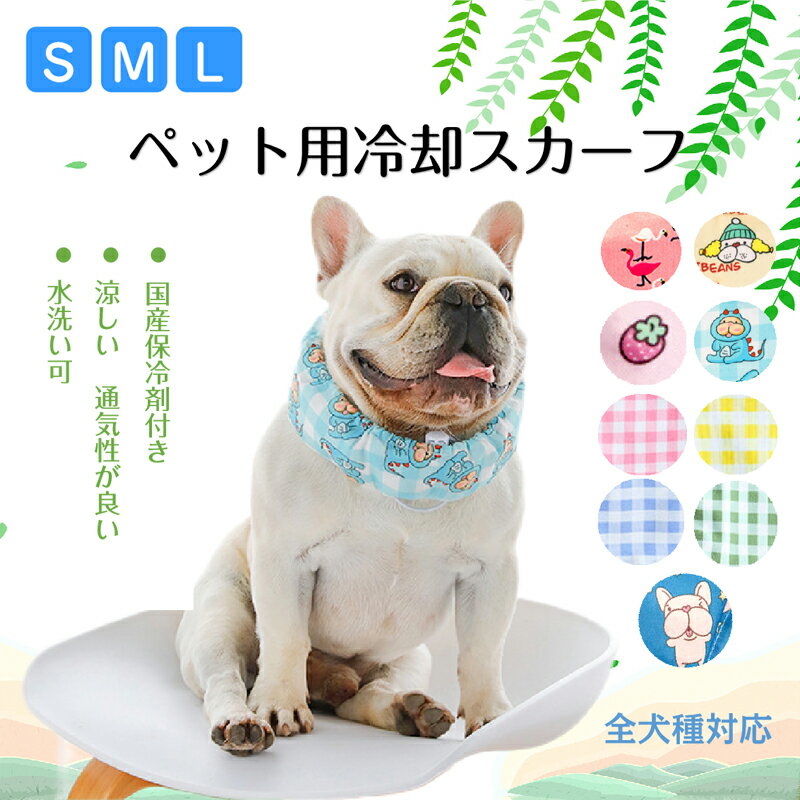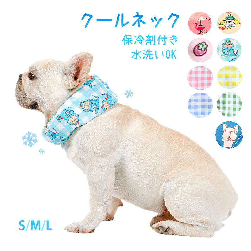 お得な保冷剤付き!首にかけるだけで夏バテ防止になるペット用クールネックです。絹や麻で織られた特製の生地は、通気性・吸湿性抜群。保冷剤を入れるだけで、首周りがひんやりとした冷感に包まれて体温を下げます。ファスナーポケット式で保冷剤の出し入れ簡単。仕切り付きで保冷剤がズレることなく、溶けてきたら交換してOK。頭からすっぽり被せて、脱げないように紐で調節するだけ。小型犬、中型犬、大型犬、どんなサイズの犬にもフィット。お散歩、ドッグラン、屋外のキャリー移動や自宅でお留守番など、様々なシーンに最適。機能性だけでなく、かわいいデザインも魅力的。内容物:クールネック×1、保冷剤素材:キャンバス生地サイズ(首周り/幅):S (約30-45cm/約10cm)、M (約45-60cm/約10cm)、L (約60-75cm/約10cm)※サイズ選びの際は、クールネックを被せる際に頭を通過できるように、首周りだけでなく頭囲も確認いただいた上でお選び下さい。例:頭囲45cmで首周り40cmの場合は、Mサイズをお選び下さい。柄:フラミンゴ、いちご、パグ、キャップ犬、恐竜、桃チェック、黄チェック、青チェック、緑チェック.※冷やしすぎないように、適宜ペットの様子を観察しながらご使用下さい。※本商品の仕様及び外観、商品情報は予告なく変更される場合がございます。※生産ロットにより、商品画像と実物で、寸法・形状・色味などが多少異なる場合がございます。※モニター発色の具合により、実物とは色合いが異なる場合がございます。