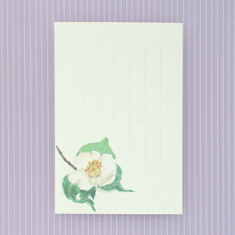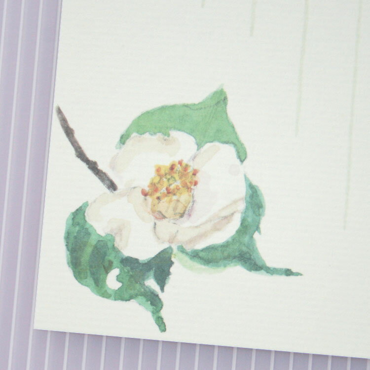 商 品 に つ い て 表面がキラキラした簀の目和紙のはがきです。 きらきらは角度によってかすかに光ります。 凛とした白い椿一輪と、手書き風の緩やかな罫線が描かれています。 古来から、日本人に愛されてきた椿。 冬でも色を変えないつやつやとした葉の緑と、花のコントラストは美しく魅力的です。 花の少ない時期に次々と咲かせ、華やかさをもたらします。 年賀状・お礼状・寒中御見舞い・季節のお便りにおすすめです。 《冬の絵はがき 一覧》 製 品 仕 様 ■素材:和紙 ■サイズ:横 10 × 縦 14.8 cm ■内容:1枚入 ■原産国:日本 ※プリンターの機種、ペン・毛筆によっては、にじみが発生することがあります。 ※宛名面には「postcard」の印字があります。 ※オフセット印刷です。 ※写真の色は、本来の色に極力近づけておりますが、諸々の条件により、実物とは色が異なる場合がございます。あらかじめご了承ください。 ラ ッ ピ ン グ ラッピングをご希望の場合は、ラッピングをお買い物かごへ入れてください。 白無地和紙無料ラッピング【0円】 季節の柄の和紙+水引付き有料ラッピング【110円】 《その他のラッピング一覧はこちら》
