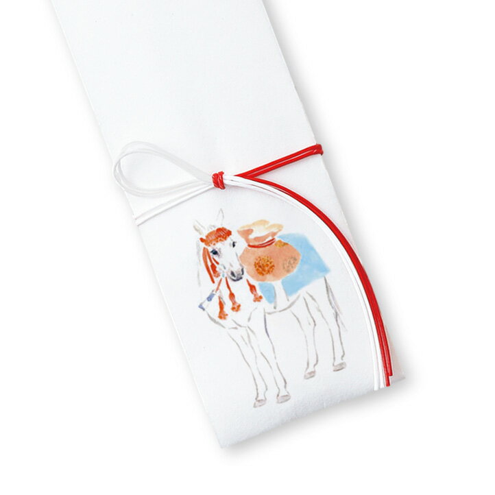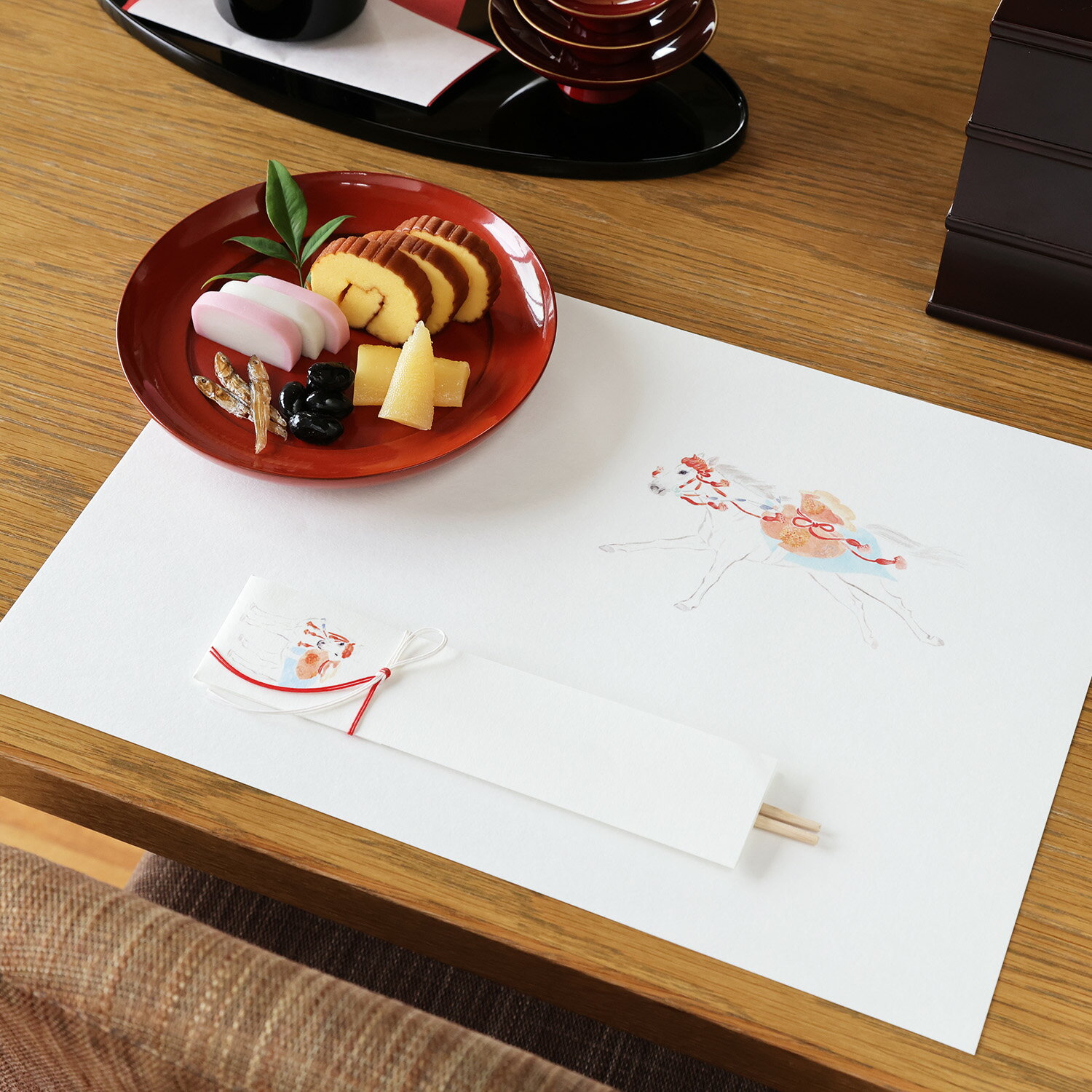 商 品 に つ い て 福がつまった巾着を運ぶ白馬の祝箸3膳入りです。 透明感のある水彩画を、ややざらりとした優しい風合いの和紙に印刷しています。 紅白の水引がめでたい雰囲気を引き立てます。 かつて馬は神々の乗る神聖な生き物とされてきました。 健脚、俊足、視野の広さが人々の生活を助け、古くから共に歩んできた馬。 なかでも白馬は幸運をもたらす特別な存在として、人々の願いや希望を培ってきました。 力強く駆ける馬と共に、すべての人の福を祝います。 巾着は砂金や金貨を入れることから、福徳を呼ぶ宝物であり、吉祥文様です。 祝い箸の両先端が細く削られているのは、片方は人間が使い、もう片方は歳神様が使うためといわれています。 お正月はもちろん、誕生祝いや還暦のお祝いなど、親族やご友人と集まるお祝いの席にもお使いいただけます。 国産檜の丸箸は24.5cm・3膳入りです。 やや短めの「子供用箸包み こうま 1膳入」もございます。 「ランチョンマット 福馬 3枚入」と揃えてお使いいただけます。 製 品 仕 様 ■素材:和紙 ■サイズ:1膳:横 5 × 縦 24.5 cm (お箸含む) ■内容:3膳入 ■原産国:日本 ※防カビ処理はおこなっておりません。また、天然木を使用しているため若干の色ムラがあることがあります。 ※写真の色は、本来の色に極力近づけておりますが、諸々の条件により、実物とは色が異なる場合がございます。 あらかじめご了承ください。 関 連 商 品 ランチョンマット 福馬 3枚入 子供用 箸包み こうま1膳入 迎春テーブルセット福馬 ラ ッ ピ ン グ ラッピングをご希望の場合は、ラッピングをお買い物かごへ入れてください。 白無地和紙無料ラッピング【0円】 季節の柄の和紙+水引付き有料ラッピング【110円】 《その他のラッピング一覧はこちら》