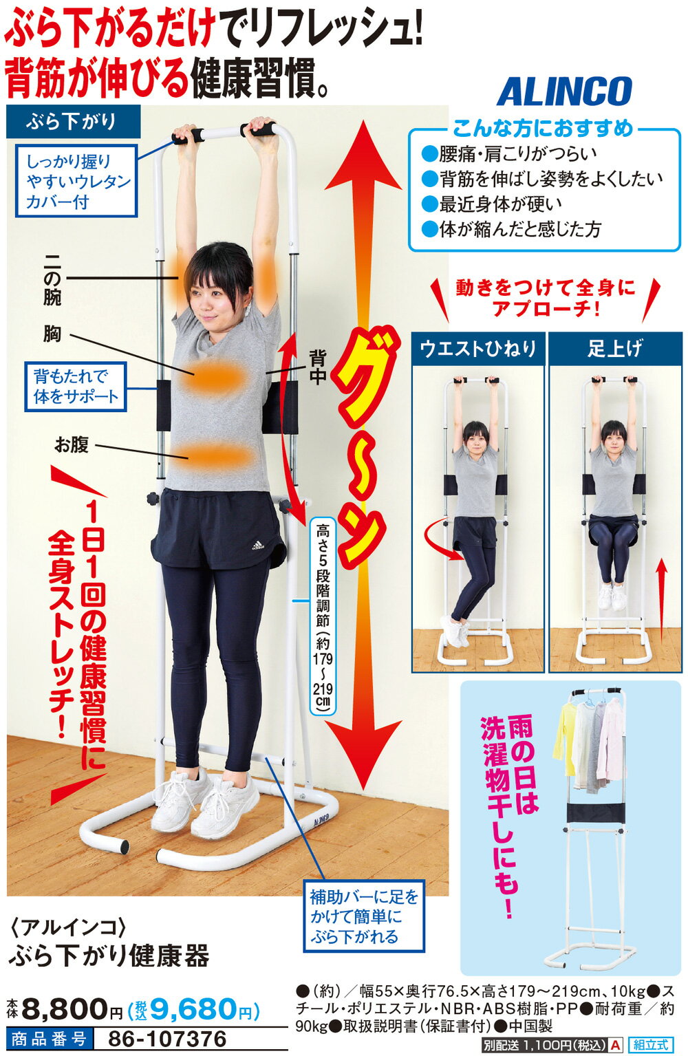 ぶら下がるだけでリフレッシュ!姿勢を維持して健康づくりに!ぶら下がるだけでリフレッシュ!正しい姿勢を維持して健康づくりに!1日1回ぶら下がって毎日の健康習慣に【ぶら下がり】・しっかり握りやすいウレタンカバー付・補助バーに足をかけて簡単にぶら下がれる【こんな方におすすめ】●腰痛・肩こりがつらい●背筋を伸ばし姿勢をよくしたい\動きをつけて全身にアプローチ!/・ウエストひねり・足上げ・体の揺れを防止するサポート付・高さ5段階調節(約179〜219cm)スペック●(約)/幅55×奥行76.5×高さ179〜219cm、10kg●スチール・ポリエステル・NBR・ABS樹脂・PP●耐荷重/約90kg●取扱説明書(保証書付)●中国製◆組立式送料1100円(大型商品のため、送料は別途頂きます)注意事項10080