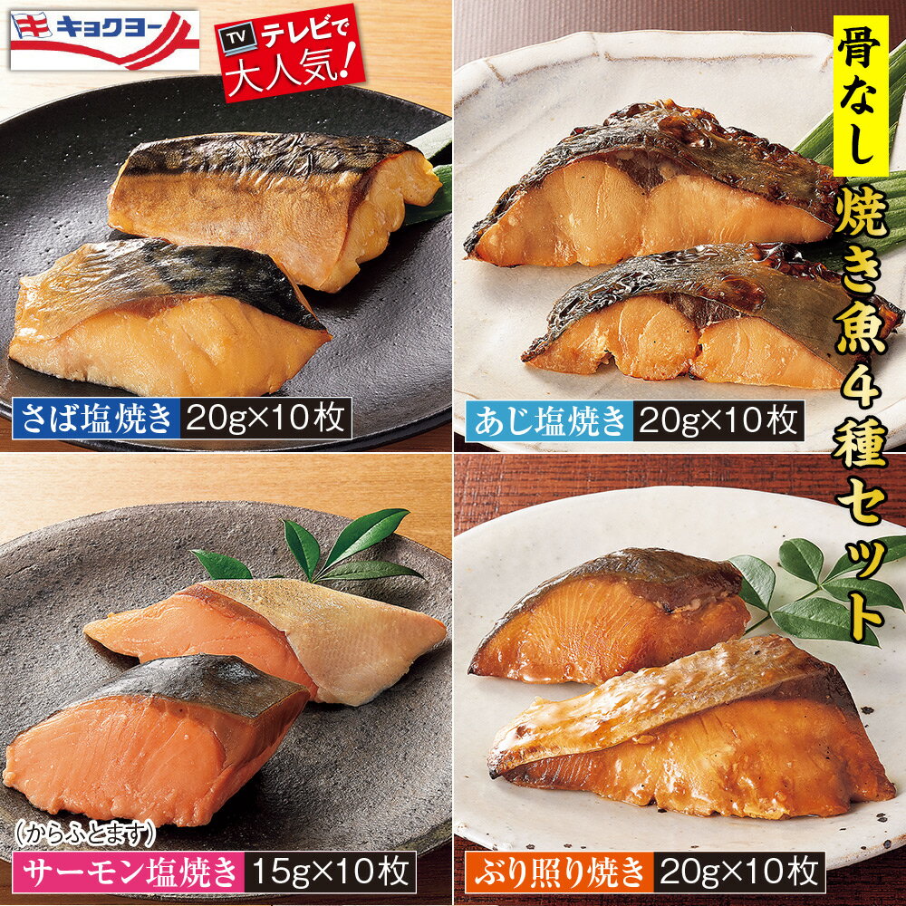 4種類の骨なし、焼き魚のセットです!・さば塩焼き脂ののったタイセイヨウサバの骨を丁寧に取り除き、ふっくら仕上げた塩焼きです。 ・あじ塩焼きあじの骨を丁寧に取り除き、ふっくら仕上げた塩焼きです。・サーモン塩焼き(からふとます)骨処理したカラフトマス切身を塩水漬け後焼き上げました。・ぶりの照り焼きぶりの骨を丁寧に取り除き、ふっくら仕上げた照り焼きです。スペック●セット内容/<さば塩焼き>20g×10枚、<あじ塩焼き>20g×10枚、<サーモン塩焼き>15g×10枚、<ぶり照り焼き>20g×10枚●賞味期限/製造日より冷凍1年6ヵ月●加工地/中国・タイ●原材料/<さば>さば、食塩、大豆油<あじ>あじ、鮭、食塩、しょうが、ぶどう糖、大豆油/調味料(アミノ酸)、酢酸Na、リン酸Na、炭酸K<サーモン>カラフトマス、食塩、大豆油<ぶり>ぶり、砂糖、しょうゆ、水あめ、酒、みりん、でん粉、食塩、かつおエキス、昆布エキス、大豆油/カラメル色素、増粘剤(グァーガム)●特定原材料等 /小麦・さけ・さば・大豆送料1100円(冷凍便でのお届け、送料は別途頂きます)注意事項81048new※送料割引の適応はお届け先毎です。1回のお申し込み数ではございませんのでご注意ください。