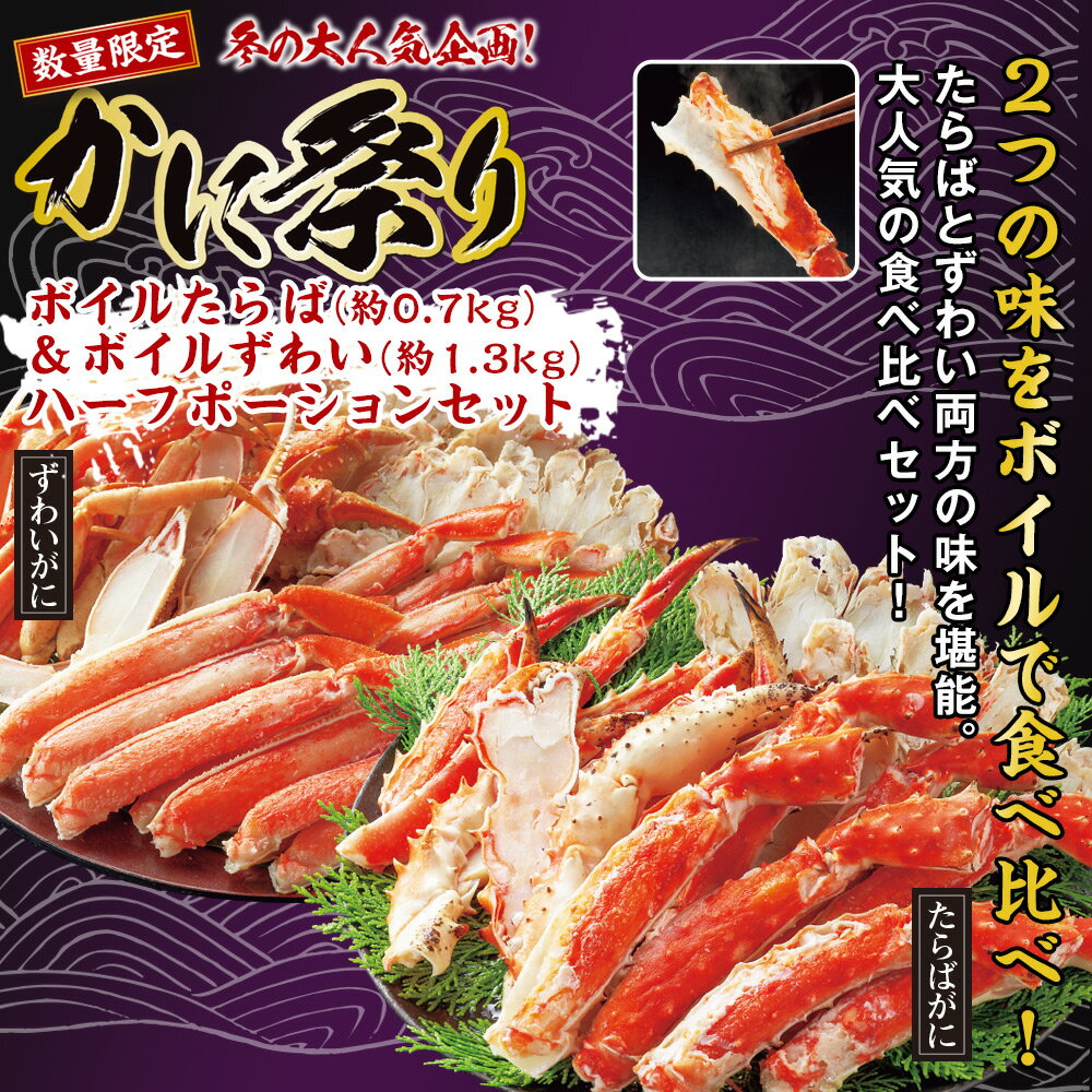2つの味をボイルで食べ比べ!【ずわい蟹(ロシア産)】【たらば蟹(ロシア産)】たらばとずわい両方の味を堪能。大人気の食べ比べセット!スペック●セット内容/たらば蟹約0.7kg、ずわい蟹約1.3kg●賞味期限/冷凍2027年4月●加工地/日本●原材料/たらばがに(ロシア産)、ずわいがに(ロシア産)●特定原材料等 /かに送料1100円(冷凍便でのお届け、送料は別途頂きます)注意事項※写真はイメージです。※解凍後そのままお召し上がり頂けます。80076※送料割引の適応はお届け先毎です。1回のお申し込み数ではございませんのでご注意ください。