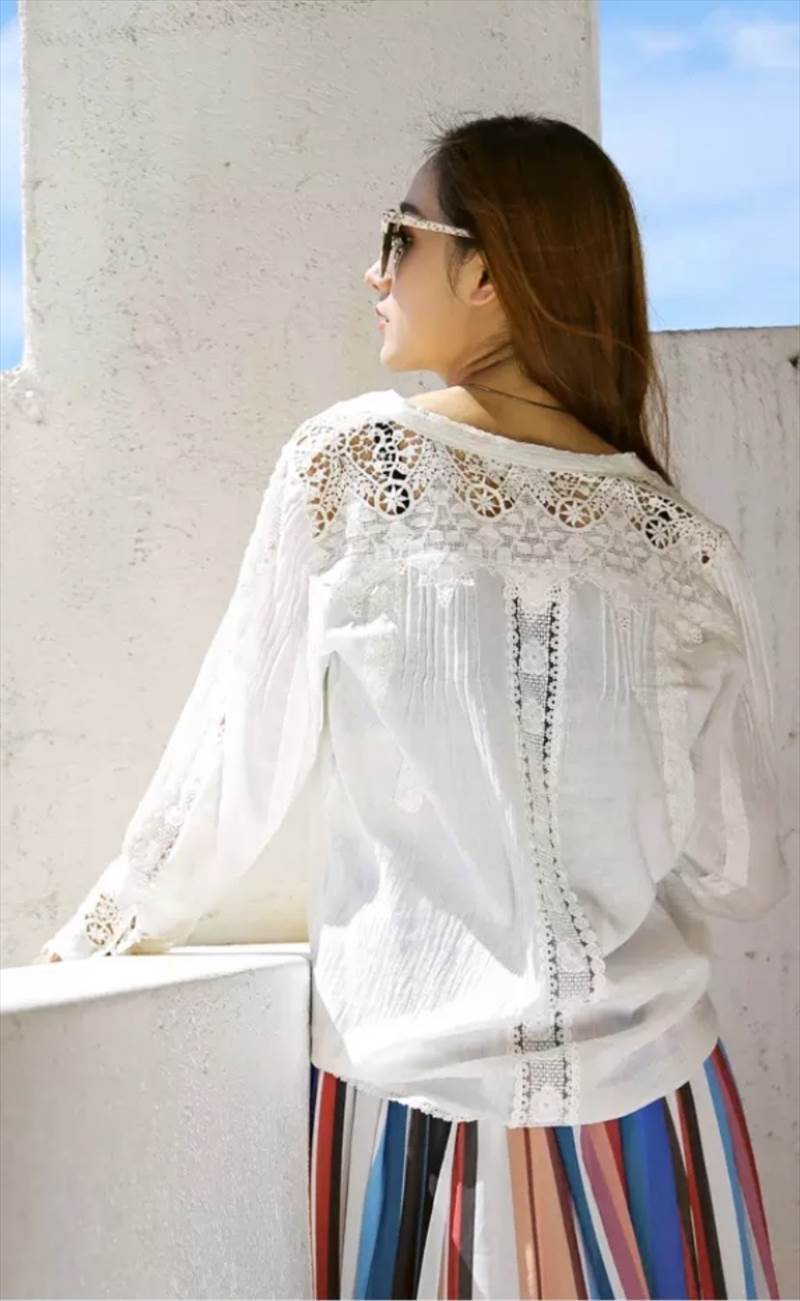 【P2倍&クーポン有】レース シャツ ブラウス トップス 春 夏 裾長め 裾イン 長袖 二の腕カバー シアー袖 萌袖 ベルスリーブ Vネック ノーカラー デコルテきれい 鎖骨きれい ストレート 羽織り 前開き 落ち感 レイヤード バック 後ろ 透け感 ホワイト 無地 S M