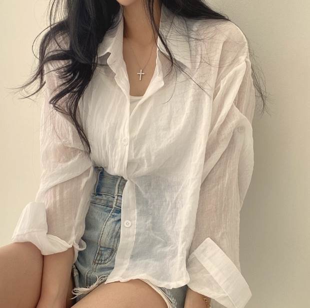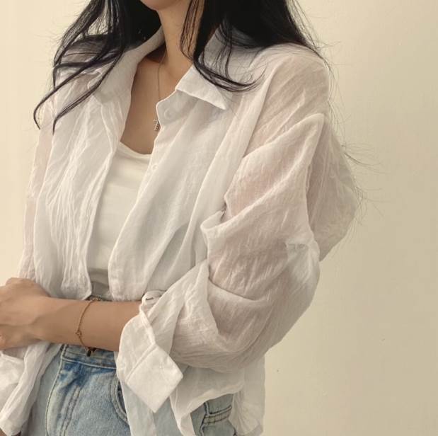 【P2倍&クーポン有】トップス レディース シャツ ブラウス 白シャツ 白トップス 夏 ショート丈 短丈トップス 裾短め 長袖 二の腕カバー 襟付き ストレート 羽織り 前開き オーバーサイズ 透け感 シアー カラバリあり グレー 灰色 ホワイト 白 イエロー 黄色 パープル