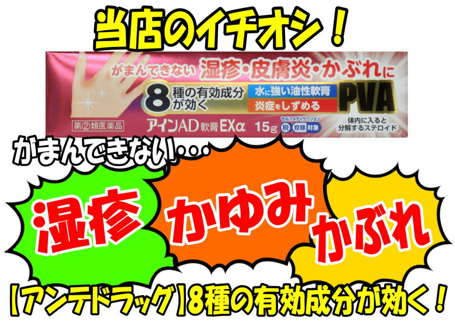[関連]: 小林薬品 アインAD 湿疹 皮膚炎 かぶれ 虫さされ かゆみ PVA アンテドラッグ 4987336761699 しっしん・かゆみ [5個までメール便にて発送] ※メール便をご希望の方は、購入画面「お支払いと配送方法」ページにて「配送方法の選択」を「メール便(日本郵政)」に変更してください。 ※メール便最大サイズを超えた場合は宅配便での発送となります。 ●効能・効果 湿疹,皮膚炎,あせも,かぶれ,かゆみ,虫さされ,じんましん●医薬品区分:一般用医薬品 ●薬効分類:鎮痛・鎮痒・収れん・消炎薬(パップ剤を含む) ジュクジュクにも カサカサにも 8種の有効成分で 我慢できないかゆみに効く!