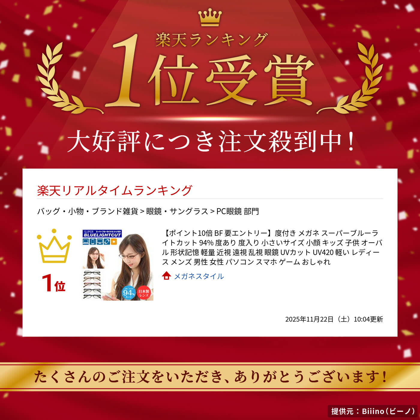 商品について ■スーパーブルーライトカットメガネとは ブルーライト(HEV400〜420nm)94%カットの日本製最新レンズを搭載したPCメガネです。 パソコンやスマートフォン・テレビ・タブレットなどから発せられるブルーライト(HEV400〜420nm)を約94%カット。 新基準の紫外線吸収材を使用しているため、従来のブルーライトカットコーティングをはるかに超えた性能です。 眼疾患の元となるルテインの損傷を防ぎ、酸化ストレスを軽減。 サプリメントを摂取するように、気軽に目の健康を保つ効果が期待できます。 また、ブルーライトだけでなく、紫外線からも目を守ります。 表面UV100%カット、裏面UV95%カットで、360度紫外線をカットするパーフェクトUVカット。無色透明なサングラスとしてもお使いいただけます。 目に優しい高性能メガネです。 ■性能だけでなく、品質にも自信あり。 スーパーブルーライトカットメガネは、ご注文を受けてから、当店で加工している受注生産(オーダーメイド)商品です。 メガネ屋として長年培った技術で、お客様にご満足いただけるよう努めています。 大量生産品と違い、1本1本当店スタッフがチェックしています。 ■フレーム 哺乳瓶や医療用カテーテル等にも使われている安心安全な軽量樹脂TR-90を使用しています。 TR-90は、弾力性や復元性に富んでいるので変形に強く丈夫。 長時間掛けていても痛くなりにくい、優しい掛け心地の形状記憶メガネです。 シンプルなデザインとカラーなので、年齢や性別・シーンを問わずお使いいただけます。 セット内容 フレーム+レンズ+ケース+メガネ拭き カラー ・ブラック ・ブラウン ・ワイン/ブラウン ・バイオレット/ブラック ・ネイビー/ブラック サイズ レンズ幅: 48mm 鼻幅: 18mm テンプル: 138mm 上下幅: 25mm フレーム幅: 130mm 素材 TR-90 生産国 フレーム:韓国レンズ:日本 注意事項 ・調節補助機能の有無、レンズを変更する場合は、別途料金が発生いたします。 ・見え方や効果には個人差があります。 ・ご使用のPC、スマートフォンのモニターによって、画像の色が実物と異なって見える場合があります。 ・商品によってはサイズに多少の誤差がある場合がございます。 ・お客様1人1人にあわせてお作りする『セミオーダー商品』のため、度あり/度なしに関わらず、ご注文後のキャンセルや変更、返品や交換は承ることができません。 【利用用途】様々な用途でご利用いただけます。 オンライン授業 パソコン授業 オンラインレッスン テレワーク ゲーム スマホ 携帯 電話 アプリ ユーチューブ Youtube インスタ 動画 ムービー ネット インターネット 映画 テレビ TV モニター 鑑賞 ソシャゲ タブレット 端末 読書 電子書籍 おうちメガネ リラックス マタニティ 不眠 安眠 視力低下 視力回復 目の疲れ 頭痛 肩こり 緩和 回復 ドライアイ 眼精疲労 眼病 眼疾病 予防 ウイルス ウィルス 対策 飛沫 エアロゾル 空気 感染 防止 男性 女性 子供 キッズ こども 大人 老人 プレゼント ギフト 誕生日 バースデー 記念日 アニバーサリー 結婚記念日 お祝い 母の日 父の日 敬老の日 ハロウィン クリスマス バレンタイン ホワイトデー 入学祝い 入園祝い 卒業祝い こどもの日 結婚祝い 入籍祝い 出産祝い 妊娠 引っ越し祝い 内祝 お返し 還暦祝い 初老祝い 古稀祝い 喜寿祝い 傘寿祝い 米寿祝い 卒寿祝い 白寿祝い 長寿祝い 金婚式 銀婚式 ダイヤモンド婚式 快気祝い 就職祝い 昇進祝い 結婚式 披露宴 二次会 2次会 ウェディングギフト ブライダルギフト 引き出物 引出物 結婚引き出物 結婚引出物 パーティー 景品 ビンゴ 大会 ゴルフコンペ コンペ景品 忘年会 新年会 ボーリング大会 謝恩会 納涼祭 夏祭り 地域イベント 賞品 粗品 福利厚生 社内イベント 抽選 販促 キャンペーン ラッピング無料 メッセージカード無料 大量注文OK商品について ■スーパーブルーライトカットメガネとは ブルーライト(HEV400〜420nm)94%カットの日本製最新レンズを搭載したPCメガネです。 パソコンやスマートフォン・テレビ・タブレットなどから発せられるブルーライト(HEV400〜420nm)を約94%カット。 新基準の紫外線吸収材を使用しているため、従来のブルーライトカットコーティングをはるかに超えた性能です。 眼疾患の元となるルテインの損傷を防ぎ、酸化ストレスを軽減。 サプリメントを摂取するように、気軽に目の健康を保つ効果が期待できます。 また、ブルーライトだけでなく、紫外線からも目を守ります。 表面UV100%カット、裏面UV95%カットで、360度紫外線をカットするパーフェクトUVカット。無色透明なサングラスとしてもお使いいただけます。 目に優しい高性能メガネです。 ■性能だけでなく、品質にも自信あり。 スーパーブルーライトカットメガネは、ご注文を受けてから、当店で加工している受注生産(オーダーメイド)商品です。 メガネ屋として長年培った技術で、お客様にご満足いただけるよう努めています。 大量生産品と違い、1本1本当店スタッフがチェックしています。 ■フレーム 哺