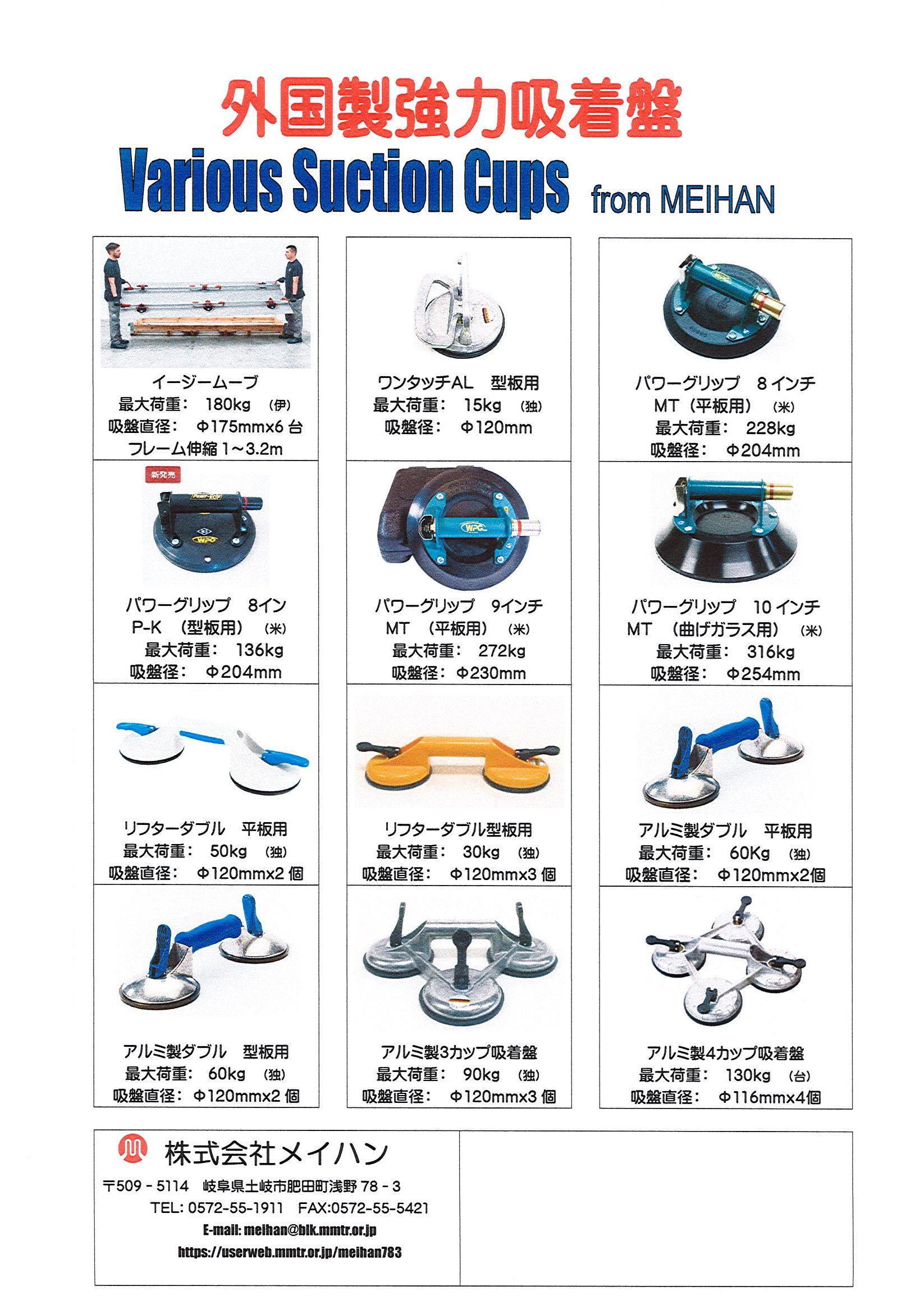 ■直径: Φ205mm■高さ: 90mm■安全荷重: 34kg■最大荷重: 136kg■ハードボックス入り■「型板ガラス」とは、片面に凸凹や型模様を付けたガラスのことです。 ■メーカー: WOOD'S POWER-GRIP (U.S.A)■ご使用方法:・ピストンを数回押して吸着させます・エアーバルブを押して空気を入れて外します■安全荷重/最大荷重について最大吸着力は、パットの大きさとバキューム吸着度(真空度)に基づいて算出されます。ANSI(米国ガラス工具研究所)では、パワーフレーム製品の安全設定確率を1/3でよいとアドバイスを受けていますが、より安全を考慮してメーカーは、1/4で算出しています。 【吸盤の使用について】 ・外側部は、特に傷をつけないで下さい。ナイフやドライバー等の鋭利な工具でゴムをゆるめようとしてはいけません。 ・使用の際には必ず吸着盤に傷がついてないか、又、油等がついていないか良く調べて下さい。 ・一見密閉性で実際は通気性のものには充分ご注意下さい。タイルや石等には一応吸着しても重みが加わるとはずれてしまいます。 ・吸盤は短時間の使用の為のものですから、同じ場所でずっと使用したり、締め直さずに持ち上げたりすると吸着能力が落ち、表面からはずれることになります。 ・吸盤は、手工具ですから、決してクレーンや起重機での使用はお避け下さい。 ・吸盤の吸着能力を超える使用は決してしないで下さい。 ・吸盤に危険な化学薬品等が触れないようにして下さい。 ■発送所要日数: 1〜3営業日