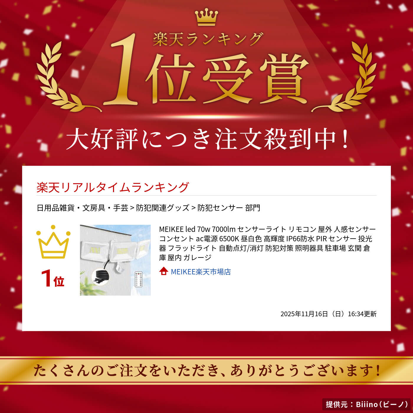 MEIKEE led 70w 7000lm センサーライト リモコン 屋外 人感センサーコンセント ac電源 6500K 昼白色 高輝度 IP66防水 PIR センサー 投光器 フラッドライト 自動点灯/消灯 防犯対策 照明器具 駐車場 玄関 倉庫 屋内 ガレージ