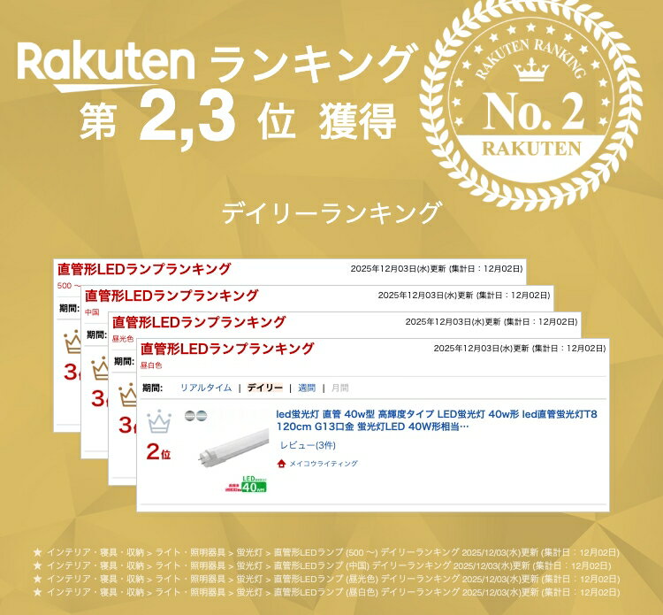 ■LED蛍光灯の特徴消費電力が少ないため電気代が約半分以下、家計に優しい。頻繁につけたり消したりしても寿命が縮むことがない。 電気をつけるとすぐに明るくなる(点灯スピードが早い) 衝撃などに強く壊れにくい。紫外線を出さないため虫が寄り付かない。寿命が大変長いため電球交換の手間がかからない。 二酸化炭素の排出量が少なく環境に優しい。 ■商品仕様 商品名:LED蛍光灯 40w形 高輝度タイプ led直管蛍光灯T8 120cm G13口金 蛍光灯LED 40W形相当 適応口金:G13 入力:85〜250V周波数:50/60Hz 消費電力:18W 全光束:2800lm(高輝度タイプ) 色温度:昼光色(6000K) 昼白色(5000K) ビーム角:180度 平均演色評価数:Ra>80 材質:ポリカーボネイト+アルミ 寸法:φ30×L1198mm 定格寿命:40,000時間点灯方式:両側直結対応・グロー式対応■注意事項:器具の点灯方式をご確認をした上にご購入してください。器具がグロースターター式の場合は、必ずグロー球を外すしてください。グローランプの付いていないラピットスタート方式、インバーター(電子安定器)方式の場合は直結工事が必要ですので電気事店にご相談ください。取付・取外しは必ず電源を切った状態で行なってください。非常用照明器具には使用できません。調光機能や自動点滅器が付いて回路は取り付けないでください。片側電流の器具には適用しません。同じ器具で従来の蛍光灯とLED蛍光灯は併用しないで下さい。装着して点灯しない場合は左右を入れ替えて装着してください。ピンがちゃんと接触しているかも確認してください。点灯中・点灯直後は直接手でふれないでください。 ※屋内用専用(屋外使用禁止) 関連商品led蛍光灯 直管 40w型 LED蛍光灯 40w形 片側配線 led...LED蛍光灯 40w形 広角度タイプ led直管蛍光灯T8 120cm...LED蛍光灯 20w形 広角度タイプ led直管蛍光灯T8 58cm ...980円780円1,020円LED蛍光灯 15w形 led直管蛍光灯T8 44cm G13口金 ...LED蛍光灯 40W型 人感センサー 120cm 直管 防虫 蛍光灯 ...led蛍光灯 直管 40w型 省エネタイプ LED蛍光灯 40w形 l...1,010円1,480円1,080円【楽天2位】led蛍光灯 直管 40w型 LED蛍光灯 40w形 le...LED蛍光灯 20w形 人感センサー付き led直管蛍光灯T8 58c...led蛍光灯 直管 40w型 高輝度タイプ LED蛍光灯 40w形 l...699円1,080円1,760円LED蛍光灯 10w形 led直管蛍光灯T8 33cm G13口金 蛍...LED蛍光灯 20w形 電球色 広角度タイプ led直管蛍光灯 T8 ...led蛍光灯 直管 40w型 LED蛍光灯 40w形 led直管蛍光灯...980円1,080円1,480円LED蛍光灯 高輝度タイプ 40w形 led直管蛍光灯T8 120cm G13口金 蛍光灯LED 40W形相当 直管LEDランプ 昼光色 昼白色 LED蛍光灯40W形。電気代が約半分以下、家計に優しい。 ■LED蛍光灯の特徴●消費電力が少ないため電気代が約半分以下、家計に優しい。●頻繁につけたり消したりしても寿命が縮むことがない。●電気をつけるとすぐに明るくなる(点灯スピードが早い)●衝撃などに強く壊れにくい。●紫外線を出さないため虫が寄り付かない。●二酸化炭素の排出量が少なく環境に優しい。●寿命が大変長いため電球交換の手間がかからない。 7