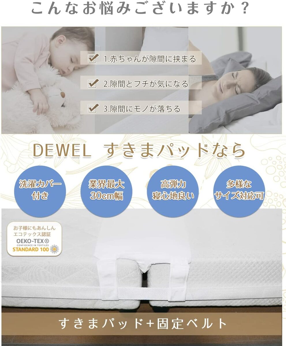 商品情報安心に使用🛏STANDARD 100 by OEKO-TEX認証を取得して、より高品質な製品を提供させていただきます。洗えるパッドカバー🛏お客様の声を応じて、パッドを改善して丸洗えい可能のカバーを開発しました。家庭でお洗濯も出来るので、いつも清潔に保てます。連結バンド幅が30cmで隙間をカバーでしっかりホールド🛏幅が広いことで隙間をしっかりとカバーして落ちにくい、20cmの物と比べて寝たときの感触をよくする効果があります。🛏クッション性にすぐれたやわらかいウレタンを採用、つなぎ目の固さを感じなくなります。マットレス同士を固定マットレス同士を強固に締めることができるため、使いうちにマットレスが離れて隙間ができることはなくなり、頻繫に調整することが要りません多くの家庭に適用固定ベルトの長さは10メートル近くあり、最大ダブルサイズのマットレス2枚にも対応できて、長さは調整可能、ぴったりなサイズを選べます。製品仕様🛏「隙間パッド」:長さ195cm×幅30cm×高さ7cm。🛏「固定ベルト」:長さ10m×幅5cm。セット内容隙間パッド *1パッドカバー *1固定ベルト *1(長さ調整可能)収納袋 *1日本語取扱説明書 *1注意事項※組立は一人でできますが、設置作業は二人で行ってください。※ご購入日より30日以内無料返品交換、3月間メーカー品質保証。※当店の商品は全て国内から配送されます。※国内配送の商品は国内でのお買い物と同じく消費税が発生いたします。関税はかかりません。※色がある場合、モニターの発色の具合によって実際のものと色が異なる場合がある。【200円クーポン付き】ベッド隙間パッド すきまパッド 洗え可能 マットレスバンド ベッド 隙間パッド 固定ベルト 隙間埋め パッド幅31cm 連結ベルト マットレス用 すきまスペーサー すきま防止 ズレ防止 連結 隙間 バンド ホワイト 洗濯可能 マットレス簡単連結 隙間バンド マットレス用隙間パッド ズレ防止 マットレス用 ズレ防止 気になる隙間をフラットに消す マットレスとマットレスの連結部分に凹凸を合わせ、すきまパッドを設置します。溝や段差が無くなることで、中央で寝ても寝返りがしやすく無理のない姿勢に。広いベッドで悠々と寝たり、家族で一緒に寝るなど様々なシーンで活躍します。 連結バンドでしっかりホールド わずか4ステップ!かんたんに設置できる 洗えるカバー付きで、いつでもキレイに シングルベッドはツインベッドになりたい方 溝や段差が無くなるをしたい方 広いベッドで悠々と寝たい方 いつもご愛顧いただき、ありがとうございます。この製品はマットレスとマットレスの連結部分に凹凸を合わせ、すきまパッドを設置します。カバー付きで、汚れた時は洗え可能です。溝や段差が無くなることで、中央で寝ても寝返りがしやすく無理のない姿勢に。広いベッドで悠々と寝たり、家族で一緒に寝るなど様々なシーンで活躍します!ぜひお勧めしたいです。 1