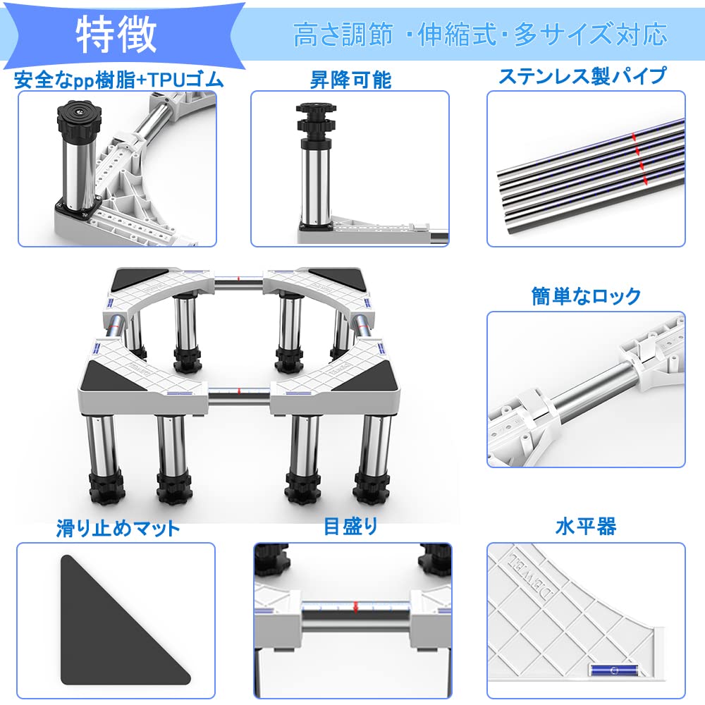 商品情報高さ調節・改良版より高くなった洗濯機置き台の最新設計が登場☆彡 素材改良:PP製→PP+ステンレスのジャッキ 増高:18-22cm高さ調節 ジャッキ8本あり:直径5.5cmのジャッキと500kgまで達した耐荷重、安定性がより一層アップされました!より多くの家電製品が対応できます! 安定強化:目盛り付きの円形ステンレス鋼管が4本あります。また、厚いパネル+水平器付き❇洗濯機台に乗せれば掃除が楽になります。伸縮式・多サイズ対応幅/奥行き:45~70cm伸縮可能 高さ:18cm-22cm ★ 縦型・ドラム式洗濯機、冷蔵庫などに対応しています。耐荷重:約500kg耐荷重500kg・減音防振全部素材が耐水耐食材質なので、水回りでの使用も錆びの懸念は要りません。専用三角の防振パッド(EVAとPP素材)ジャッキ底のゴム製マット ❇専用防振EVAパッドを家電の下に置くと、洗濯機の異音と振動が吸収できます。品質素材なので、キズ・色移りの心配も要りません。縦型・ドラム式洗濯機両対応、耐荷重内のその他家電や家具にもお使い頂けます。品質素材・大型家電のパートナーDEWEL洗濯機台が家電の騒音振動、錆び腐食、電気漏れ、排水不便、床のキズ・色移りなどのお悩みを解決します。本製品は高品質なステンレス鋼とABS樹脂を採用しました。円形ステンレス鋼のパイプは4本あり、安定性や耐腐食性も抜群です。洗濯機 台 DEWEL 8足円形鋼管4本式 冷蔵庫 置き台 昇降可能 奥行/幅:45〜70cm 高度調節18~22cm 耐荷重:500kg ジャッキ付き 防振 冷蔵庫 台 異音振動軽減 防振パッド 水準器付き 日本語取扱説明書付き 3年保証 洗濯機をかさ上げる 専用置台 防振減音機能もバツグン 耐荷重500KG 高さ調節 防振 防滑 床保護…機能が多い! 従来版の洗濯機置き台を改良した最新設計。●素材改良:PP製→PP+ステンレスのジャッキ ●増高:18-22cm高さ調節●ジャッキ8本あり:直径5.5cmのジャッキと500kgまで達した耐荷重、安定性がより一層アップされました!より多くの家電製品が対応できます! ●安定強化:目盛り付きの円形ステンレス鋼管が4本あります。また、厚いパネル+水平器付き❇洗濯機台に乗せれば掃除が楽になります。 ネジ締め作業不要&30秒で組立できる 排水加速&振動や異音を吸収できる 最大500KG対応&耐水耐食&家電寿命をのばす 家電を移動したく下のスペースを掃除したい 洗濯機作動時ガタガタする異音が大きい 家電を湿気から守り、長持ちさせたい いつもご愛顧いただき、ありがとうございます。この製品は2021最新版・洗濯機/冷蔵庫用専用置台です。高度を調節可能、伸縮タイプなので、ほとんどの家電が対応可能。ぜひお勧めしたいです。 1